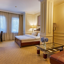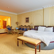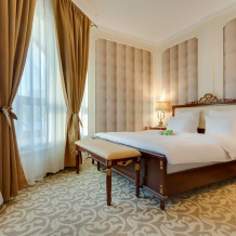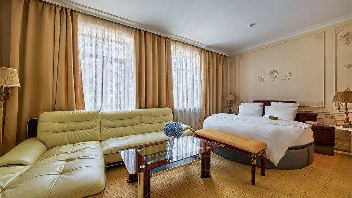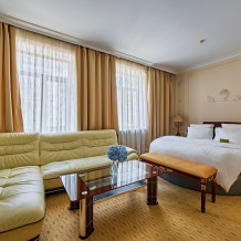 Идеально подходит для деловых людей: уверенное достоинство классического интерьера, удачная планировка вкупе с гостиничным сервисом, технической оснащенностью и свободным доступом в Интернет позволяет, при желании, устроить мини-офис и успешно вести бизнес прямо из номера. Возможные типы кроватей: круглая и квадратная.