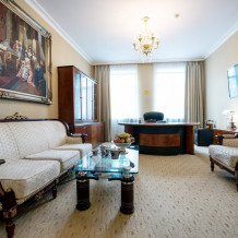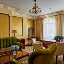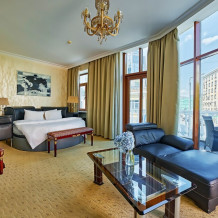 Один из лучших апартаментов Москвы. Номер с видом на Николоямскую улицу украшен хрустальными люстрами, резными орнаментами, антикварной мебелью. В апартаментах имеются 2 спальни, гостиная-кабинет, мини-кухня, ванная комната с гидромассажной ванной-джакузи, 2 раковины, дополнительный гостевой туалет. Идеальный вариант для длительного семейного проживания. Типы кроватей: King Size + 2 Queen Size. Возможна установка дополнительных спальных мест.