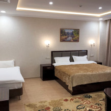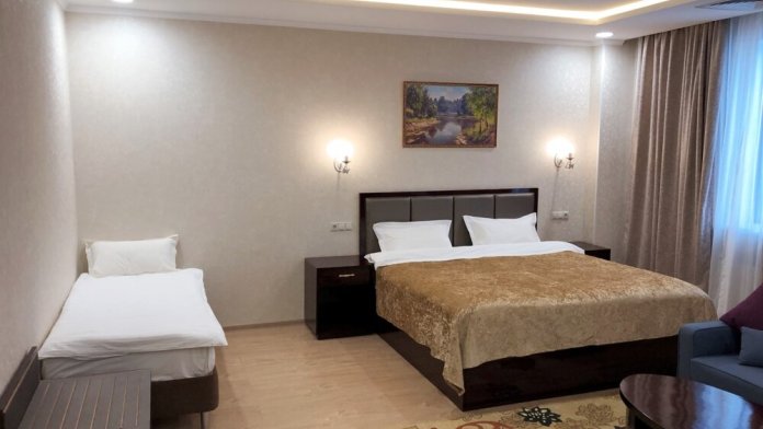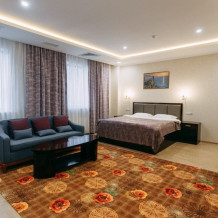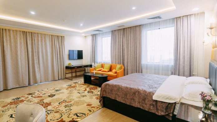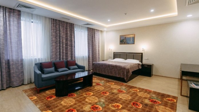 Просторные номера площадью от 53 до 73 кв. м оснащены всем необходимым: телевизор, кондиционер, холодильник, чайник, сейф, телефон, Wi-Fi и ванная комната. Гостям предоставляются полотенца, тапочки и косметические принадлежности.