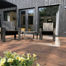 с плитой, двухместный диван в обеденной зоне и современный санузел с необходимыми туалетными принадлежностями и полотенцами, а на террасе шезлонги и зона для барбекю. Если Вы планируете путешествие с ребёнком до 3-х лет, предупредите нас заранее и мы предоставим ему отдельную кроватку.