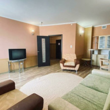В гостиной комнате имеется диван, два кресла, журнальный столик, барная стойка со стульями, ТВ, сплит- система, холодильник, телефон, набор столовых принадлежностей.