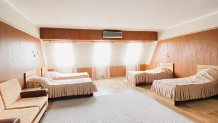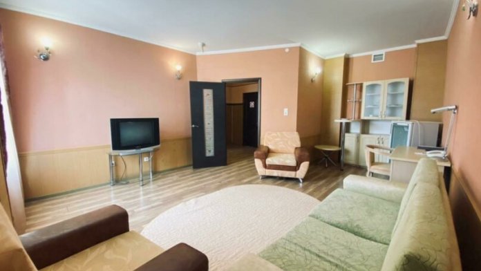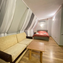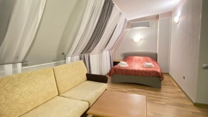В спальной комнате: двуспальная кровать, прикроватные тумбочки, туалетный столик с пуфиком, телевизор, сплит-система. В ванной комнате имеется фен, туалетные принадлежности, тапочки, набор индивидуальных средств гигиены.