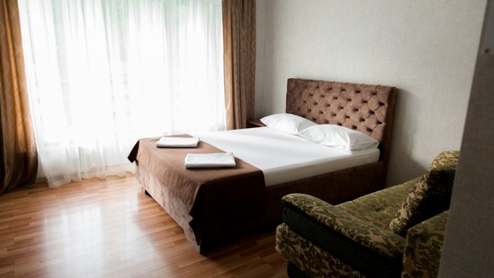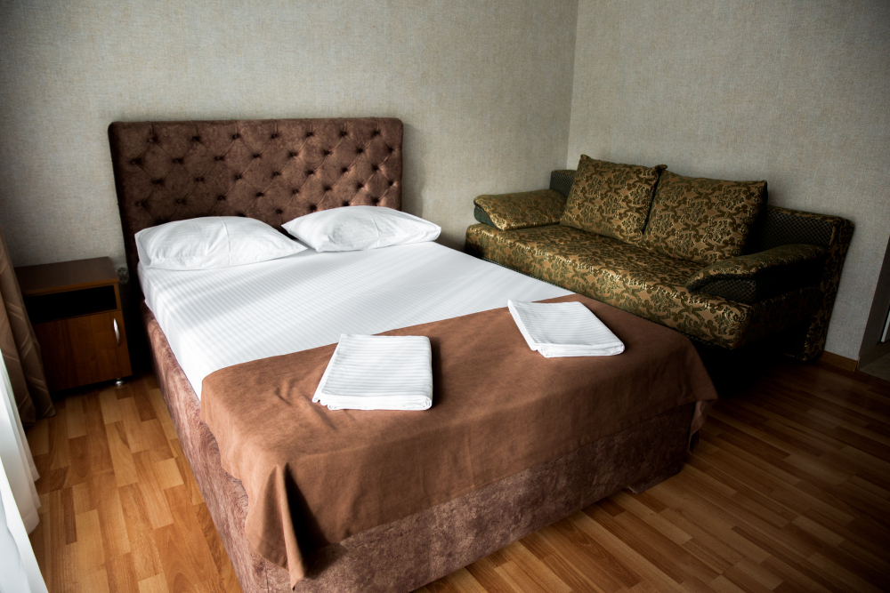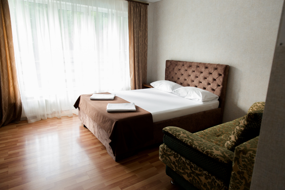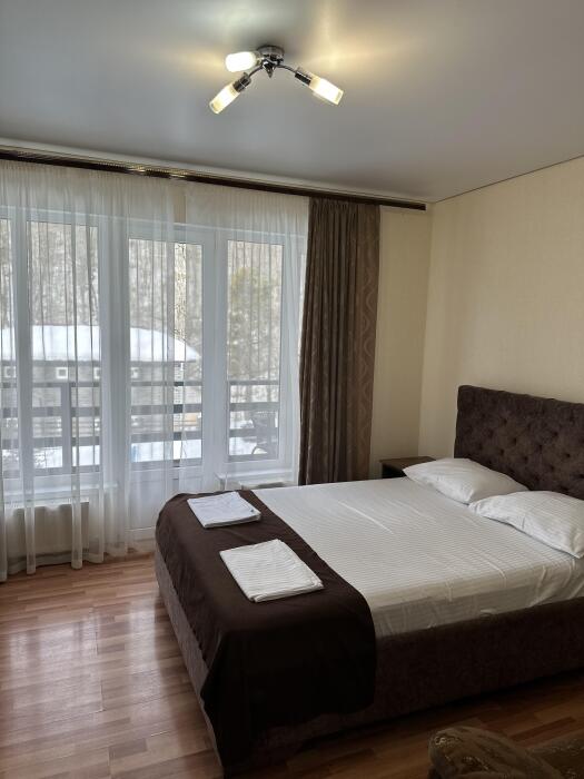 В комнатах - двуспальные кровати, в гостиной - раскладной диван и панорамные окна.