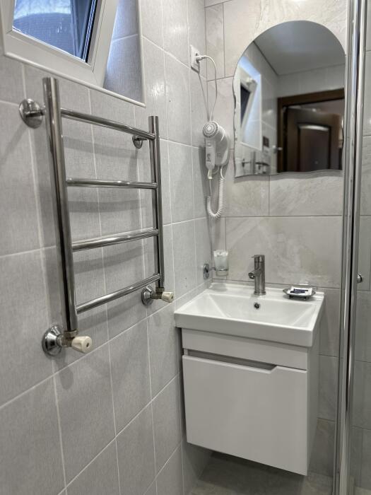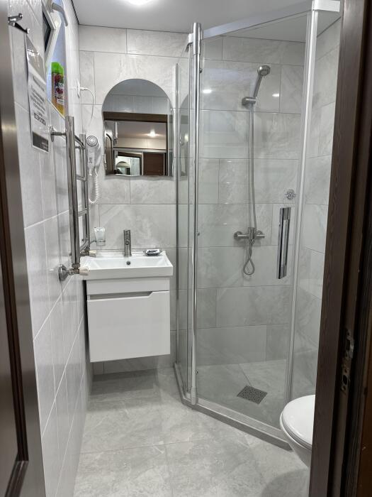 Ванная комната с душевой кабиной и туалетными принадлежностями, предоставляем полотенца, халаты.