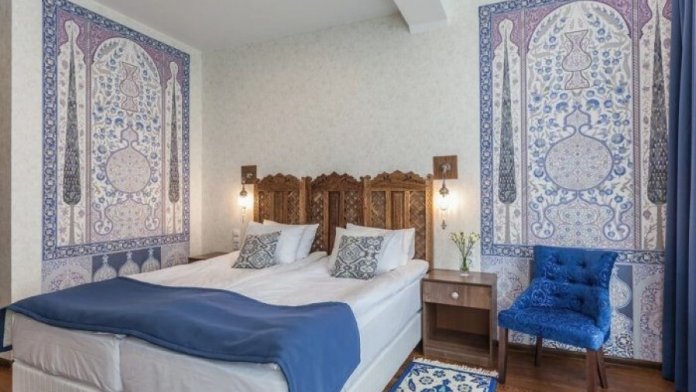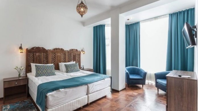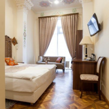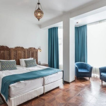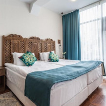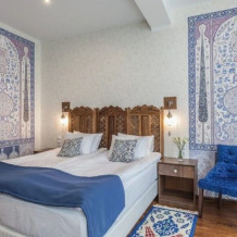 Все номера нашего отеля оформлены в восточном стиле с элементами и арабского, и персидского, и среднеазиатского искусства. В дальнейшем каждому номеру будет присвоено имя одного из городов Шелкового пути по порядку их прохождения, и в зависимости от названия, в номере будут присутствовать особые декоративные элементы или картины. Картины с изображением пейзажей и достопримечательностей стран, территории которых входили в Великий Шелковый Путь, мы планируем также повесить в холле отеля. Интерьер отеля мы старались сделать более уютным, в отличие от ресторана «Навруз», где он более музейный, поэтому технику ганча и росписи почти не использовали, кроме элементов стен в некоторых номерах и потолка в холле отеля, который расписывали приглашенные мастера из Узбекистана. Дизайн-проекта у нас не было, все до мелочей продумывалось самостоятельно: мебель делали на заказ, обои, плитку, светильники и т.д. выбирали тоже лично. Изголовья кроватей во многих номерах привезёны из Хивы, где были вырезаны вручную из уникального и очень прочного дерева Карагач.