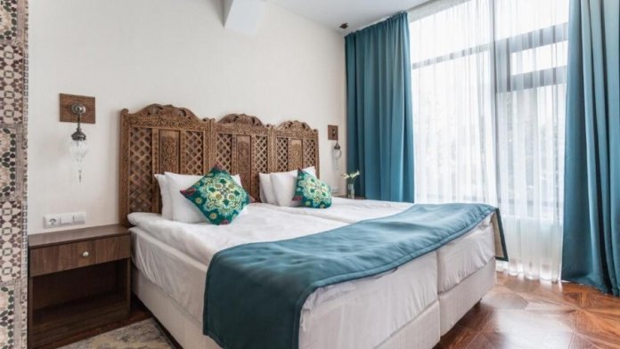 Во многих номерах гостей ждут удобные кровати с изголовьями, вырезанными вручную из дерева карагач искусными мастерами Хивы (Узбекистан).