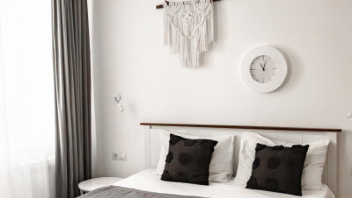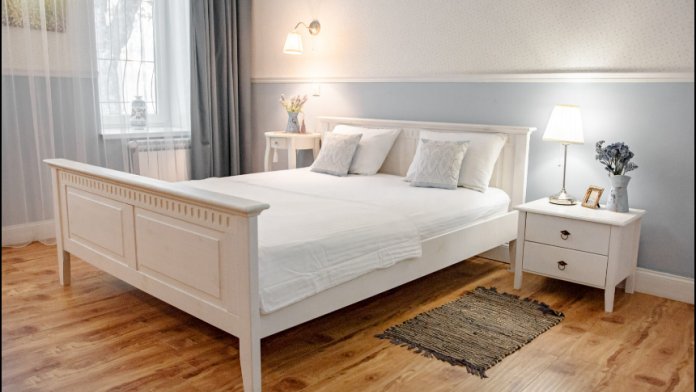 Спальня с большими окнами, кровать с удобным ортопедическим матрасом, 100% хлопковое постельное белье.