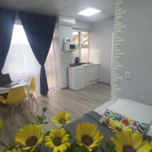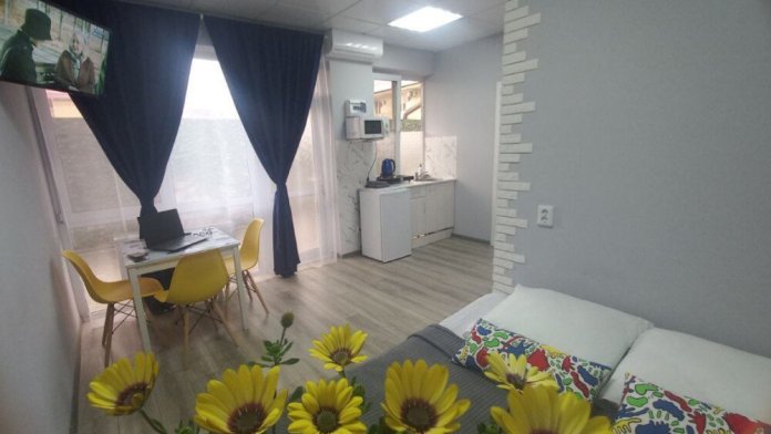 Пространство разделено на две комнаты: спальню и гостиную-столовую. В столовой есть уютная гостиная зона с диваном (диван-кроватью), телевизором и столовой группой.