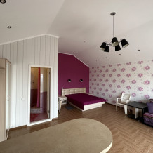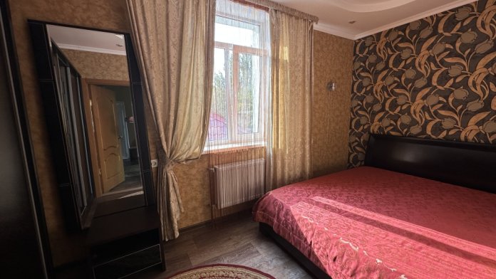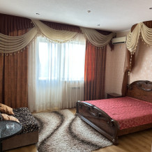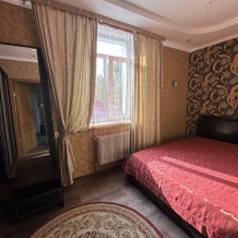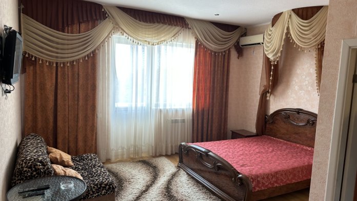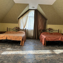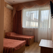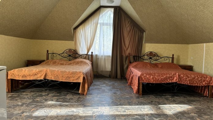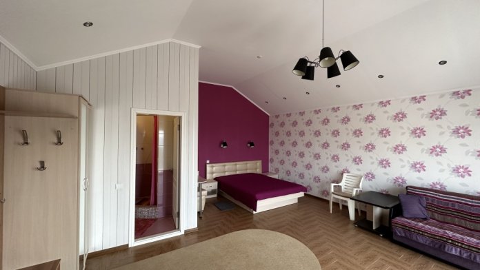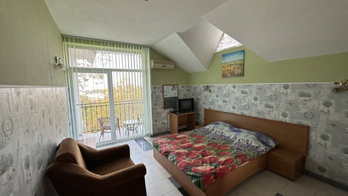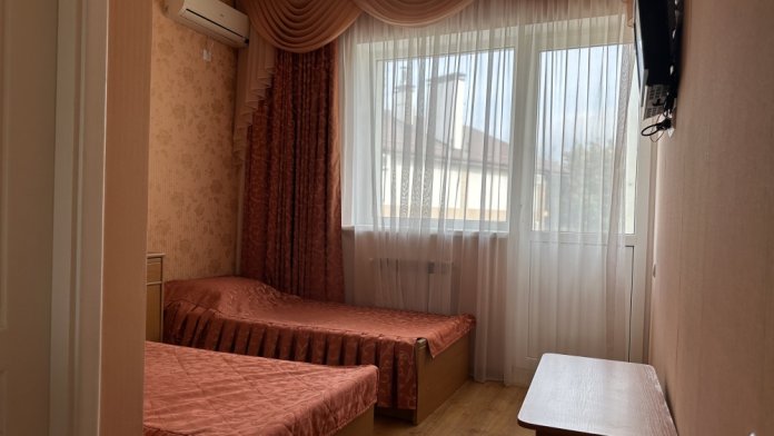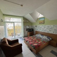 Однокомнатный номер с балконом и возможностью размещения 4-х человек. В номере: две большие кровати, трюмо, телевизор, холодильник, электрочайник, кондиционер. Небольшой кухонный уголок с набором посуды, микроволновкой, чайником и раковиной. Санузел совмещен. Около номера есть уютная беседка и мангальная зона.