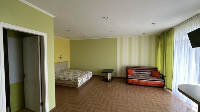 Очень просторный однокомнатный номер с большим балконом. Возможно проживание до 4-х человек. В номере: двуспальная кровать, прикроватные тумбочки, раскладной диван, кресло, шкаф для одежды, трюмо, телевизор, холодильник, кондиционер, электрочайник. Санузел совмещен.