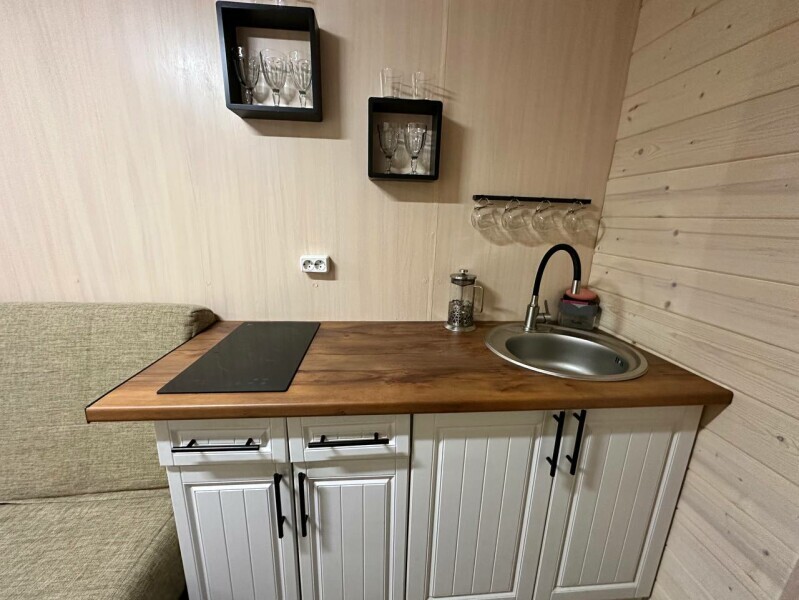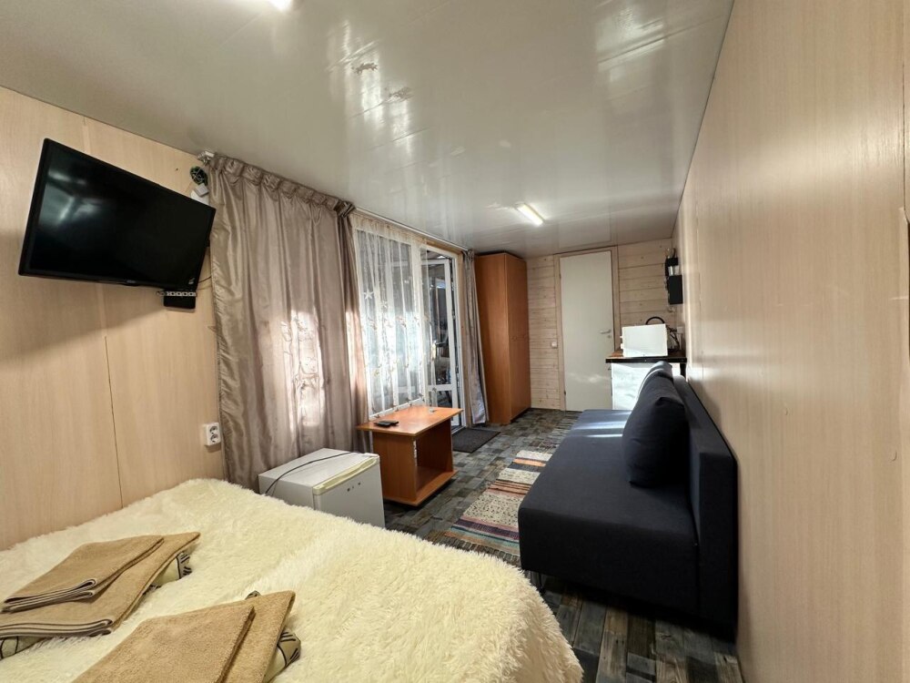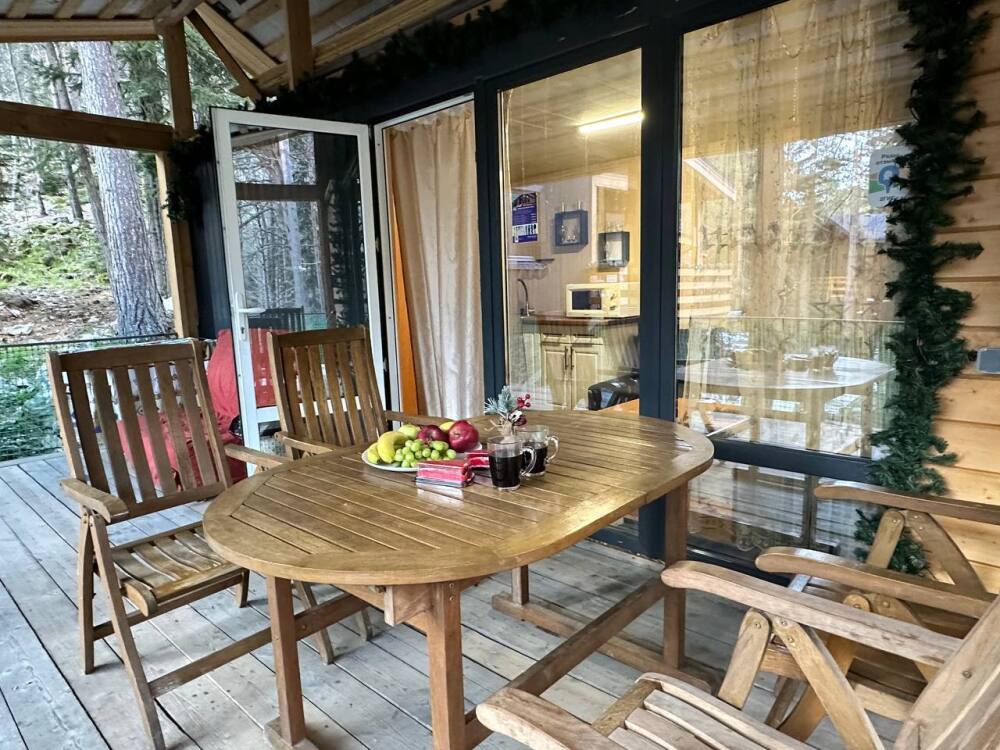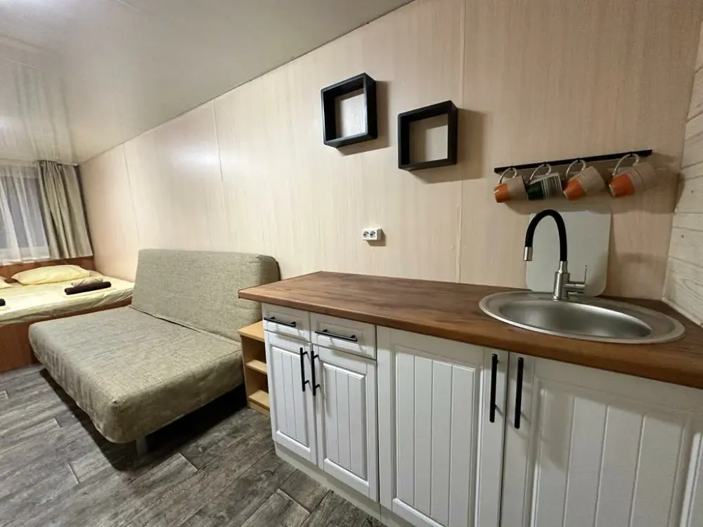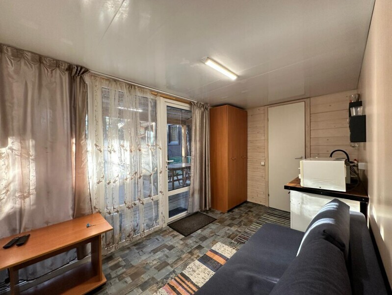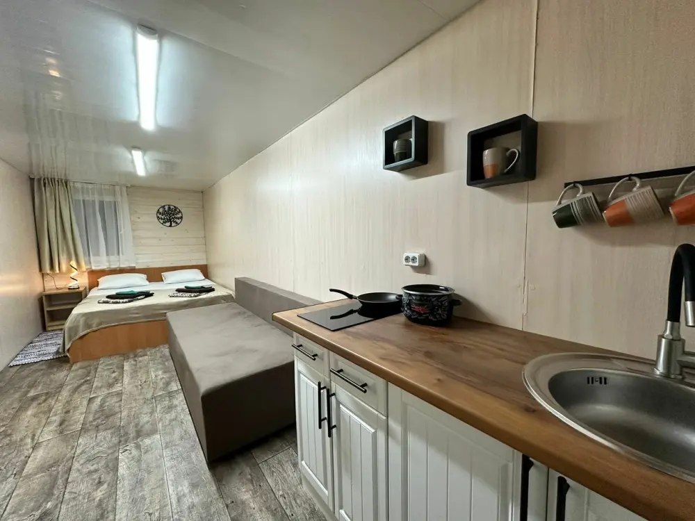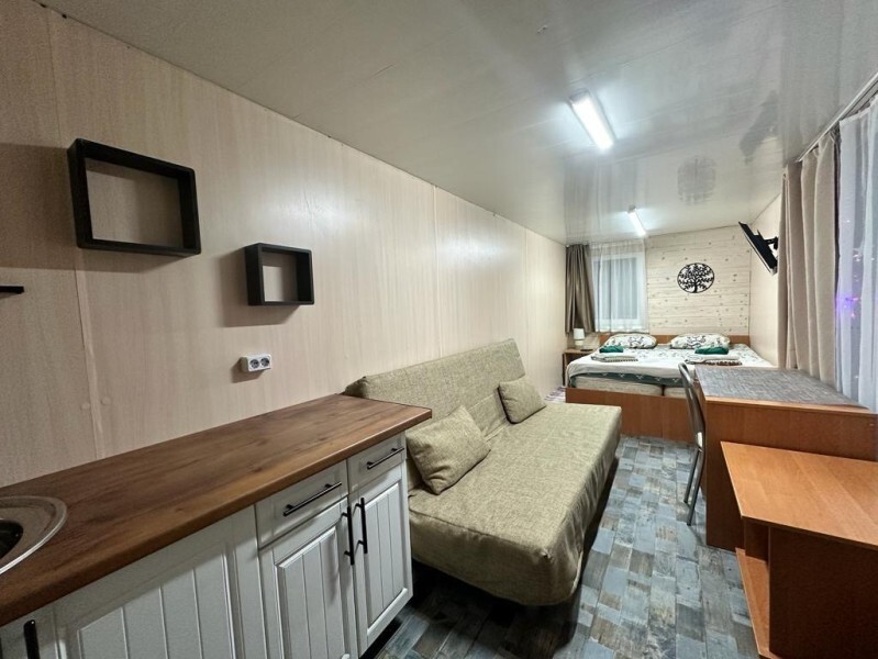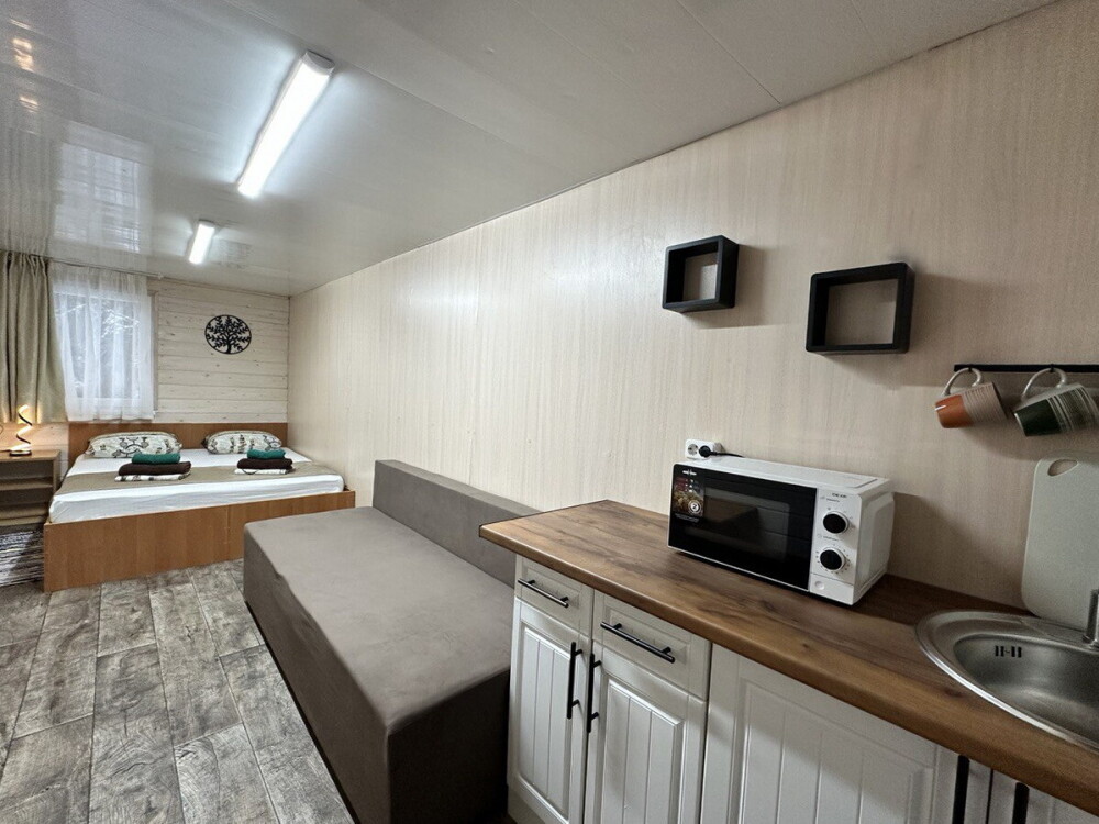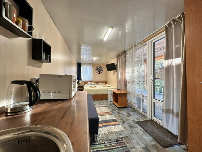 Домик-студия с большой верандой в лесу с видом на горы, рассчитан на 2-3 человека. В каждом домике есть мультиварка, чайник и необходимая посуда. Перед домиком бесплатная парковка под камерой видеонаблюдения. На территории есть мангал и казан.