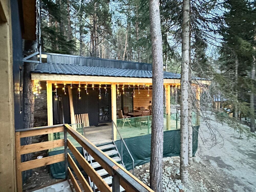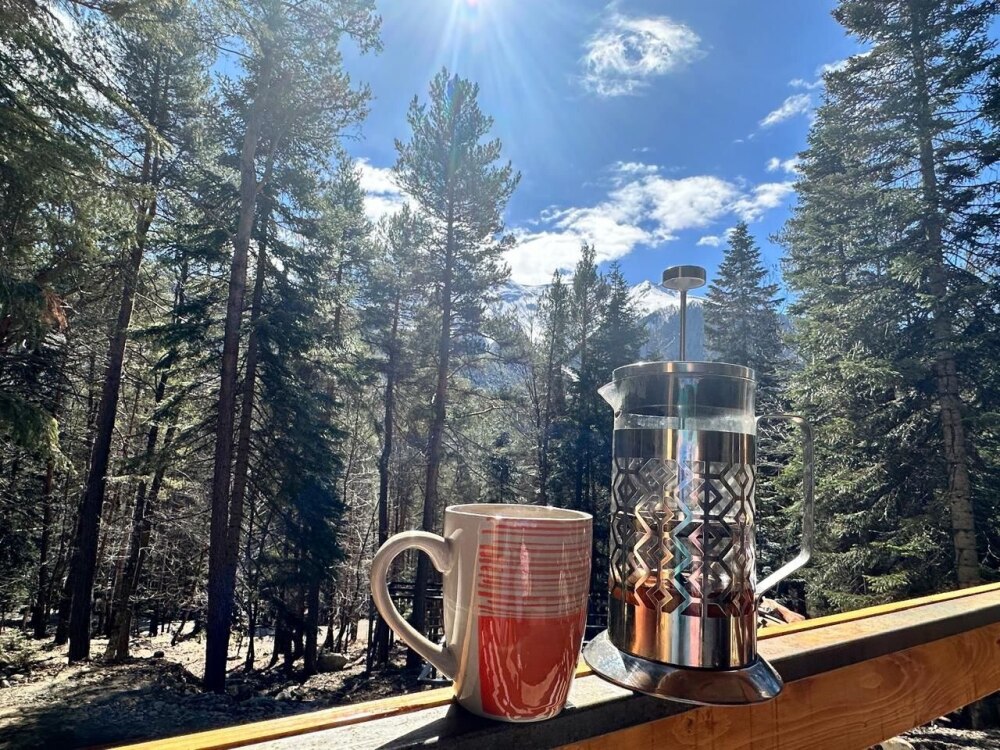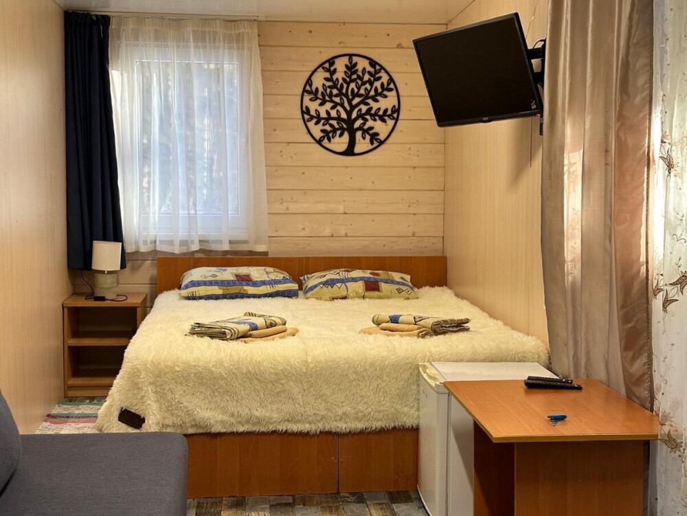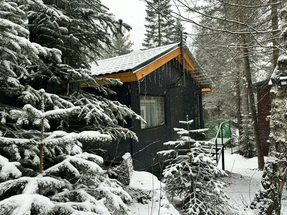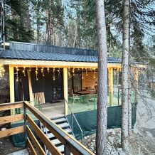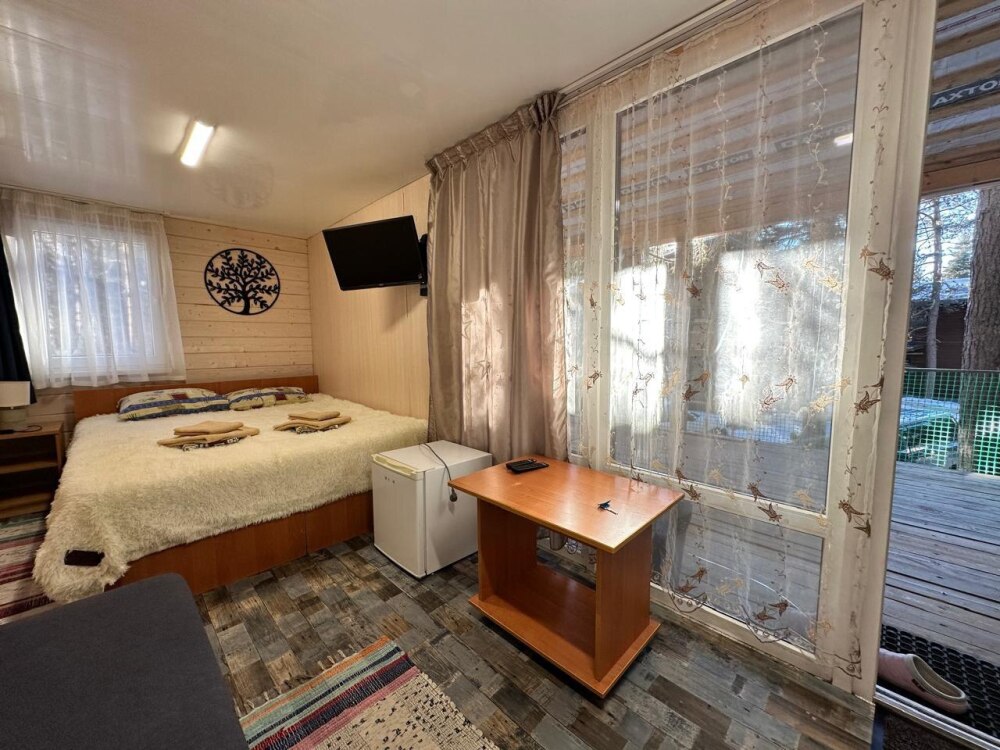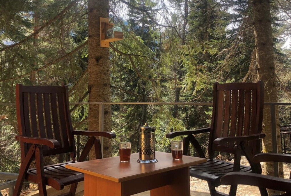 Домик в окружении вековых сказочных деревьев с видовыми окнами на лес и снежные вершины гор. В домике одна двуспальная или две односпальные кровати, ТВ, холодильник, санузел, интернет. Есть стол со стульями, чайник, мультиварка и необходимая посуда. Большая веранда с видом на лес и горы. На территории есть мангал, костровая чаша. Стоянка под камерой видеонаблюдения.