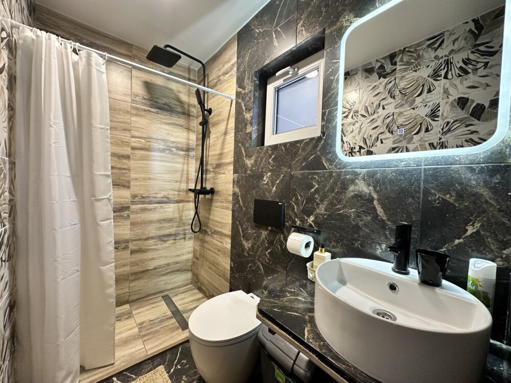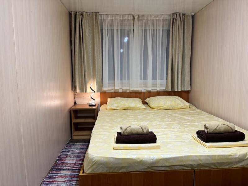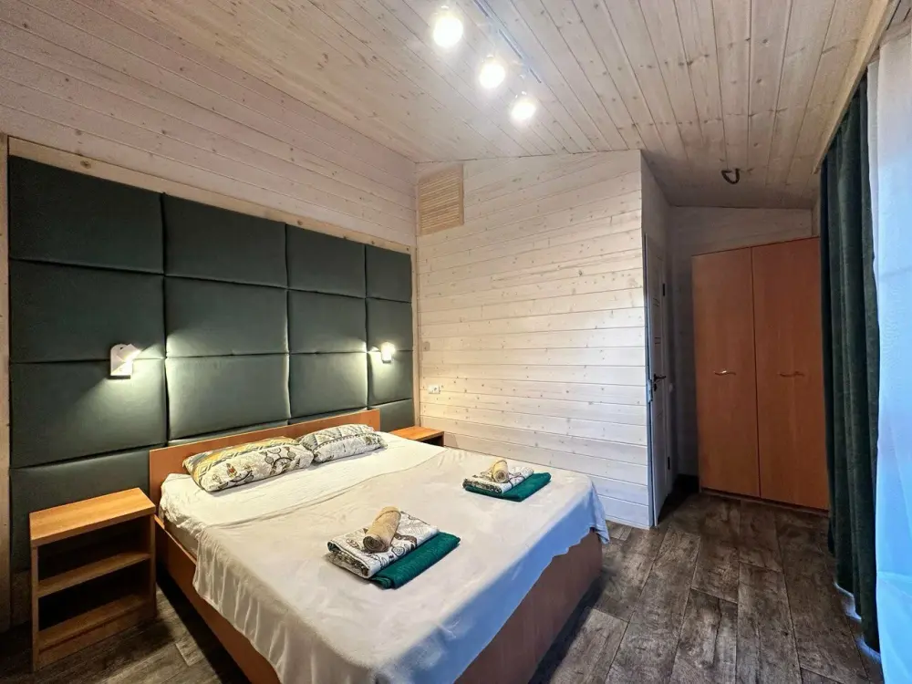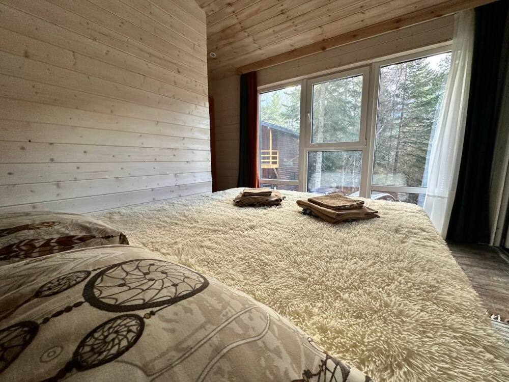 Первая комната - спальня: двуспальная кровать, санузел, теплый пол, панорамные окна на лес и горы.
