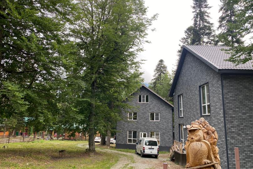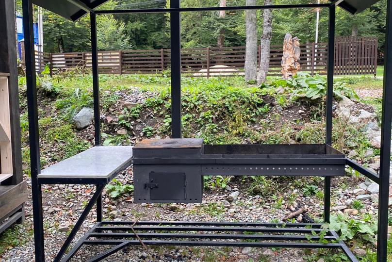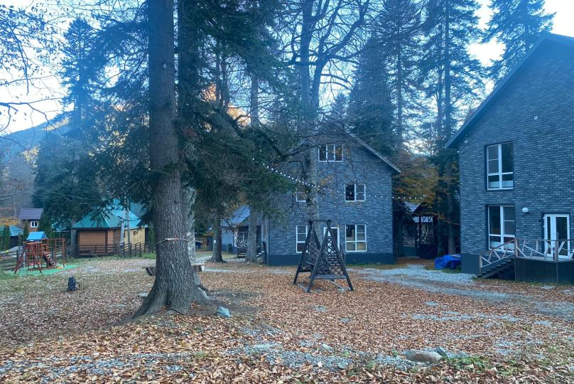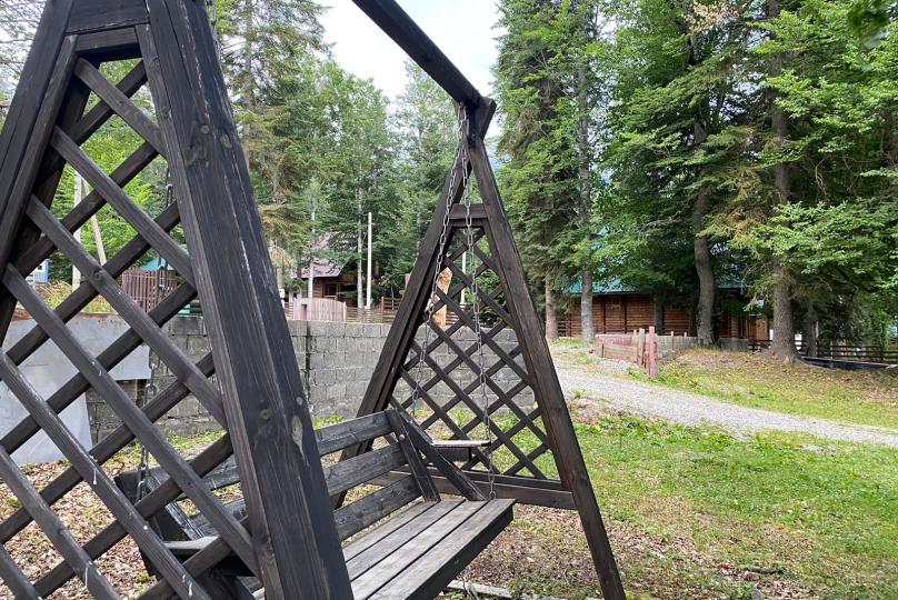 Также на зеленой территории расположены 2 бани, вместимостью до 6-ти и 8-ми человек. Мангальные зоны для всех домиков, собственная беседка для большой виллы. Детская площадка для самых маленьких.
