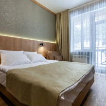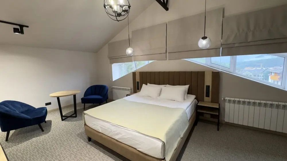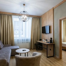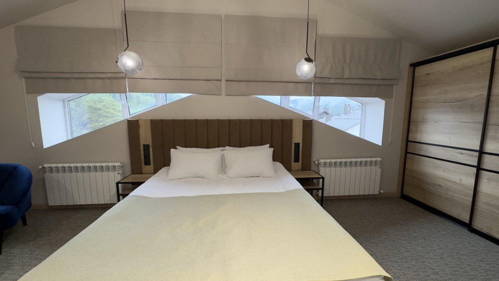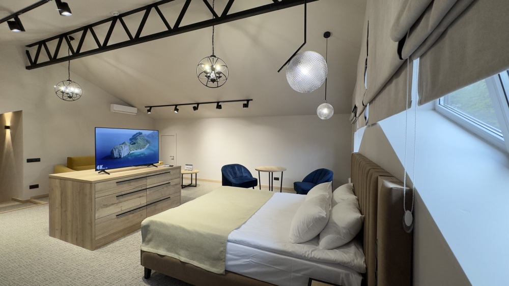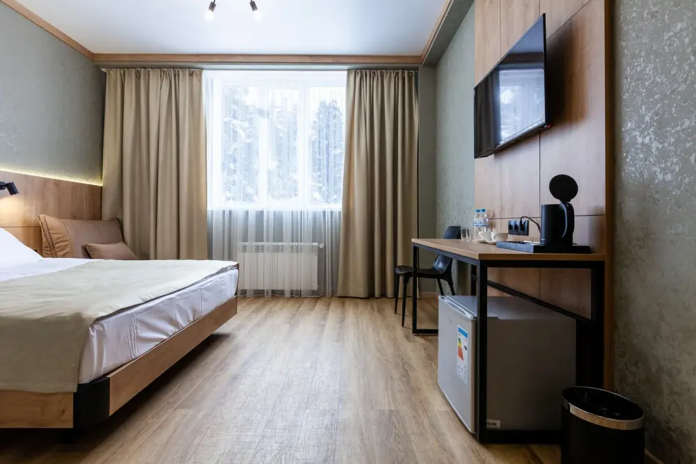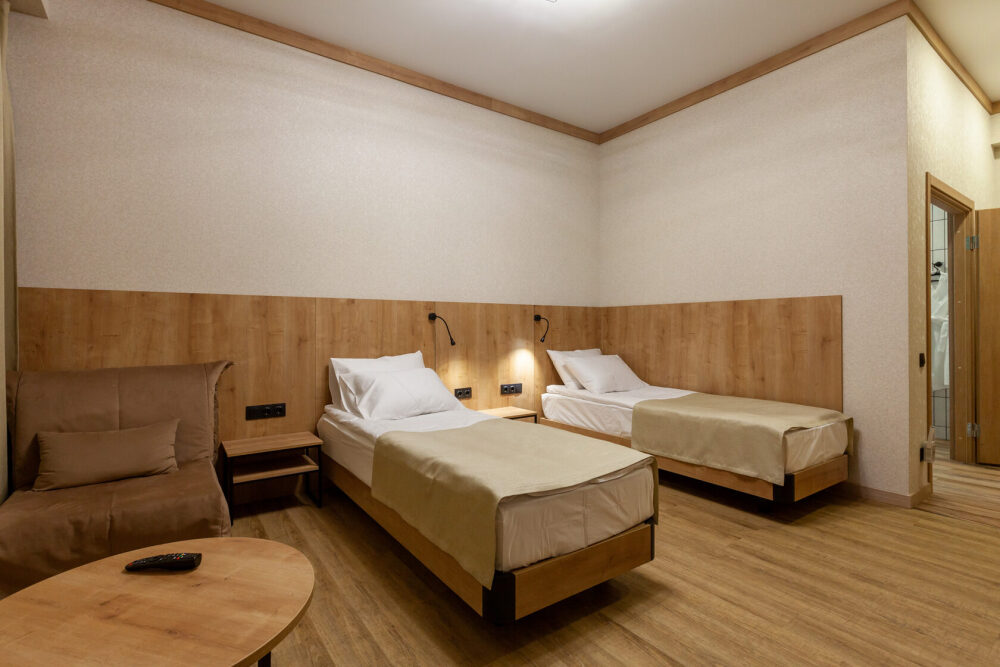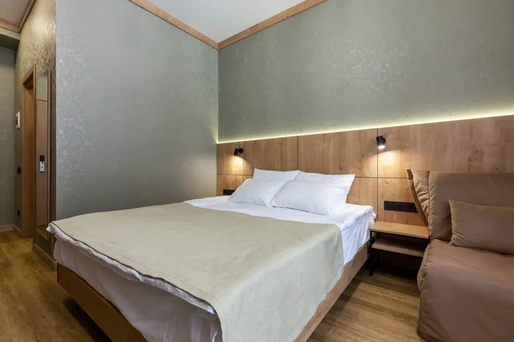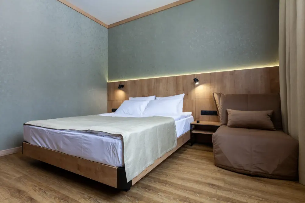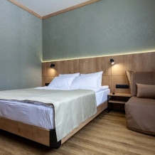 Номер предполагает 1 спальное место - 2-местная кровать. В наличии раскладной комфортный диван + возможность установки раскладной кровати (1 доп. место). Бутылка воды в качестве комплимента.