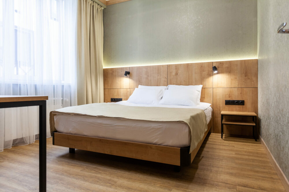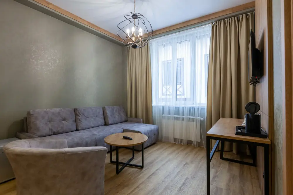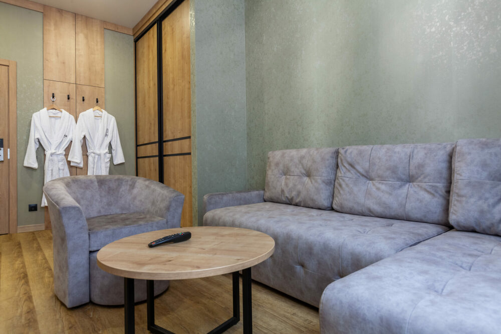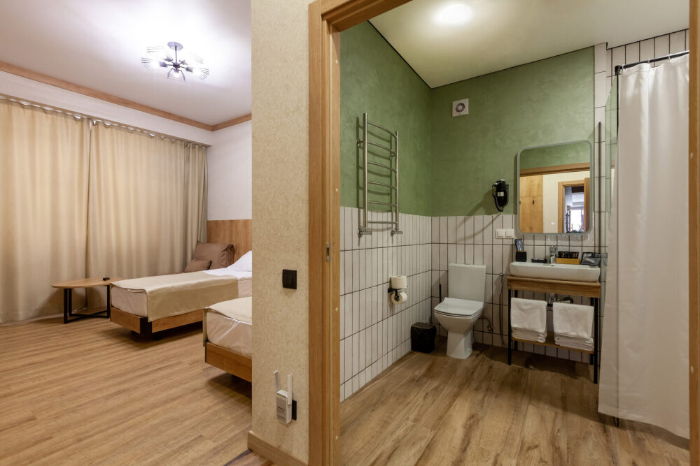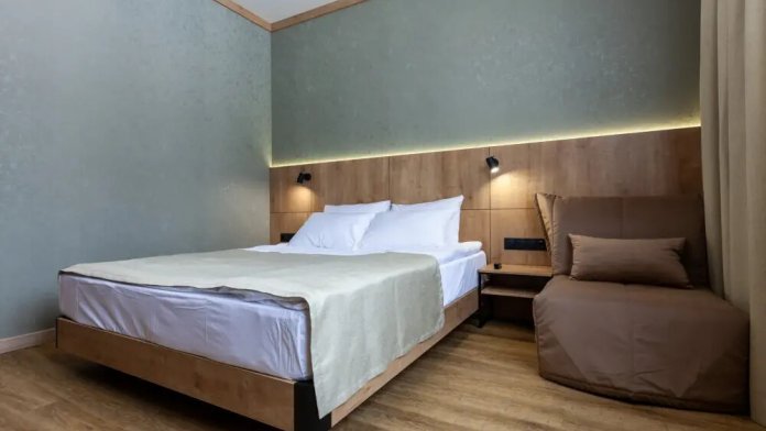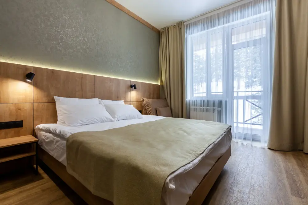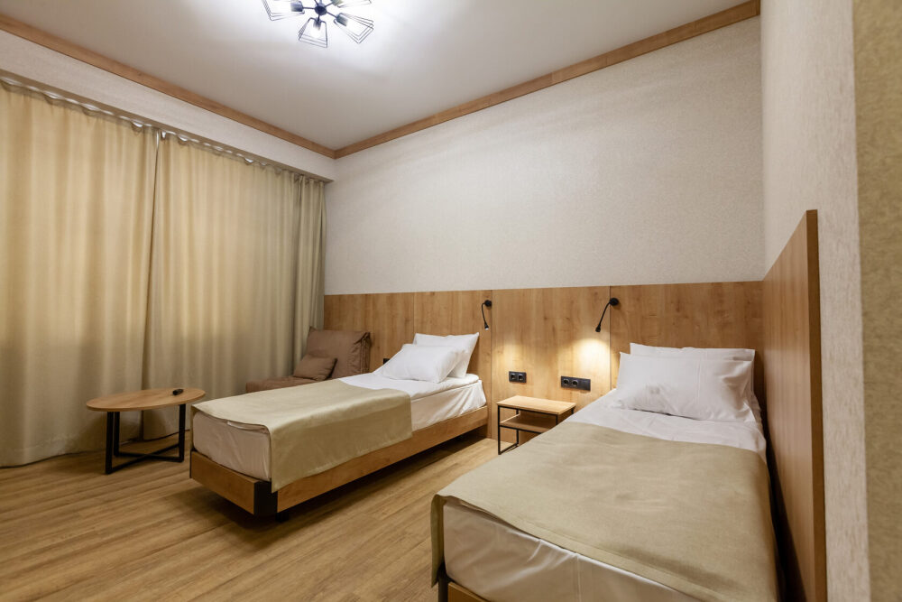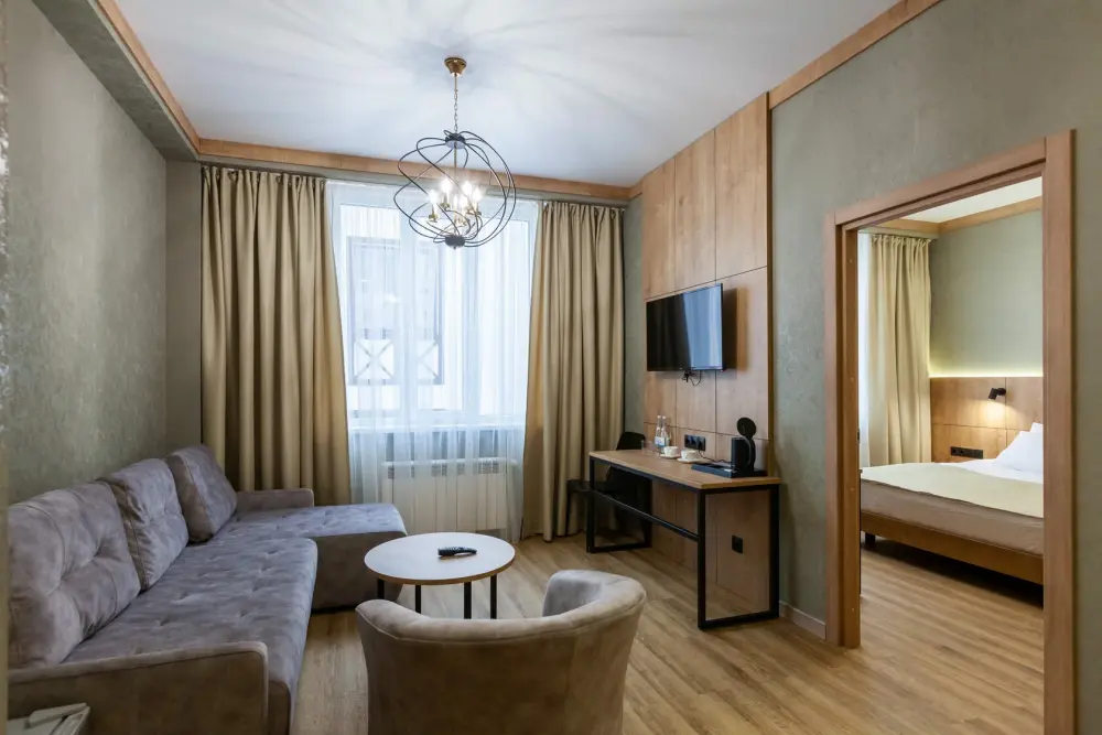 Номер предполагает 1 спальное место - 2-местная кровать. В наличии раскладной комфортный диван + возможность установки раскладной кровати (1 доп. место). Бутылка воды в качестве комплимента.