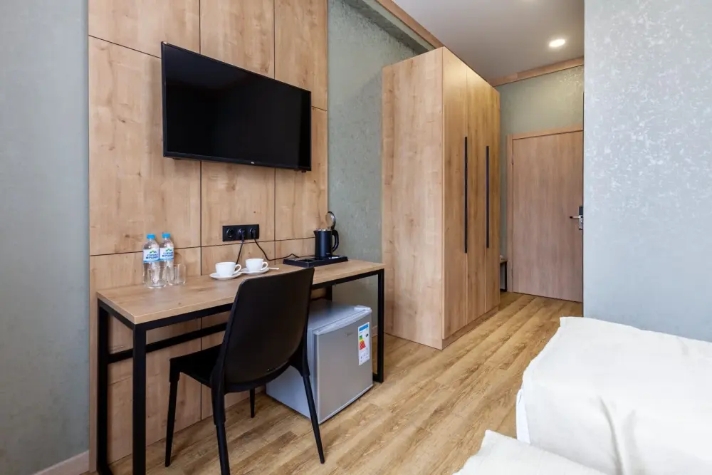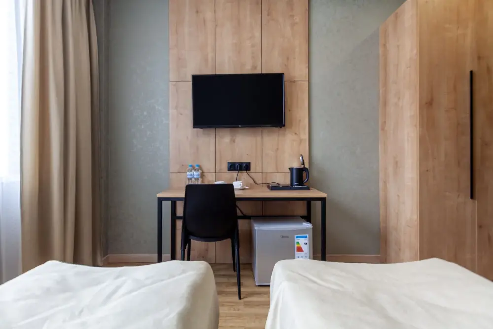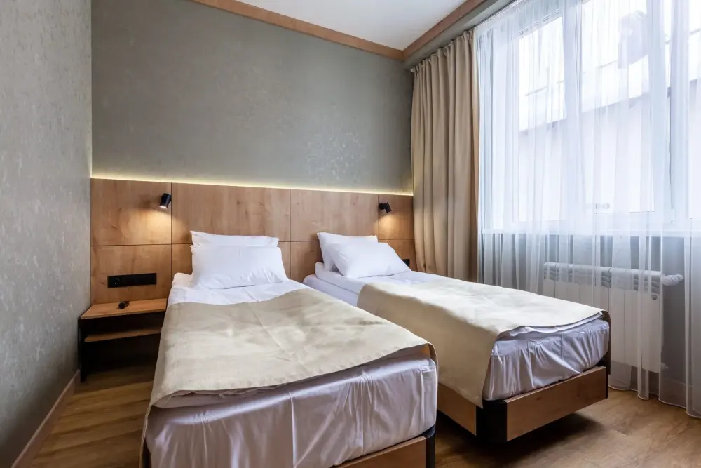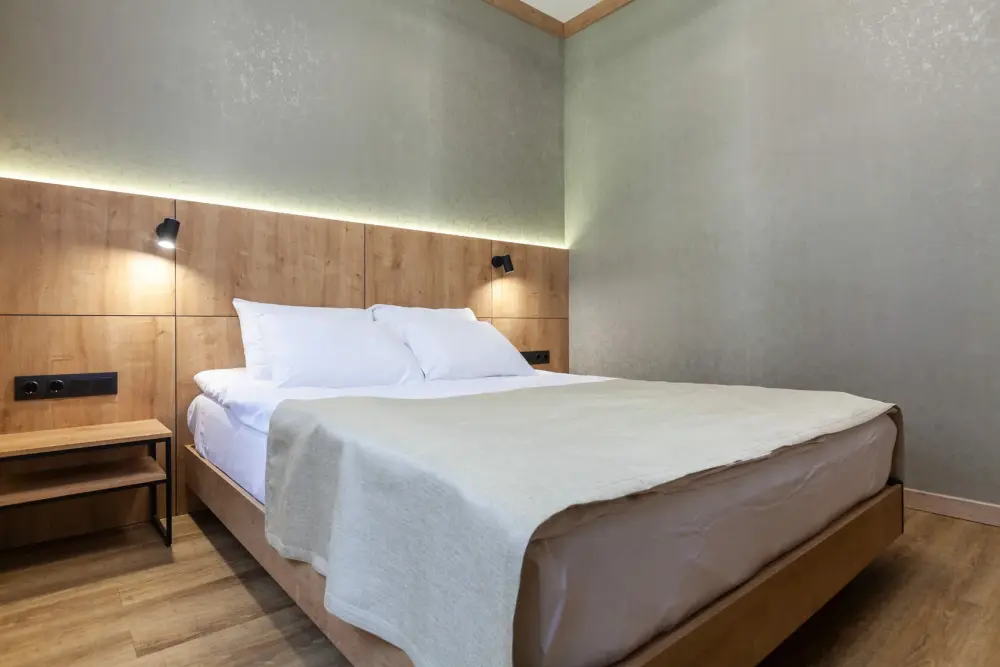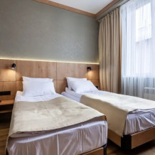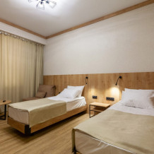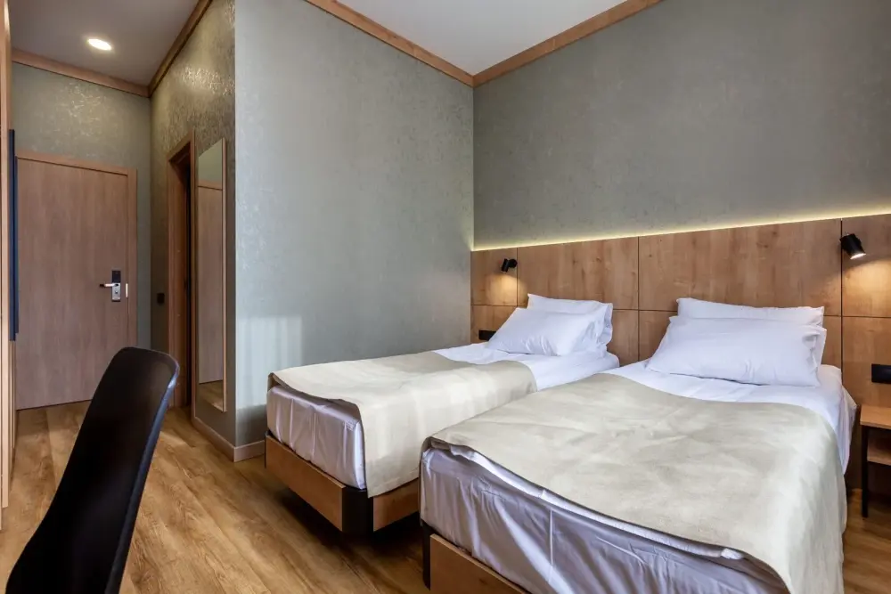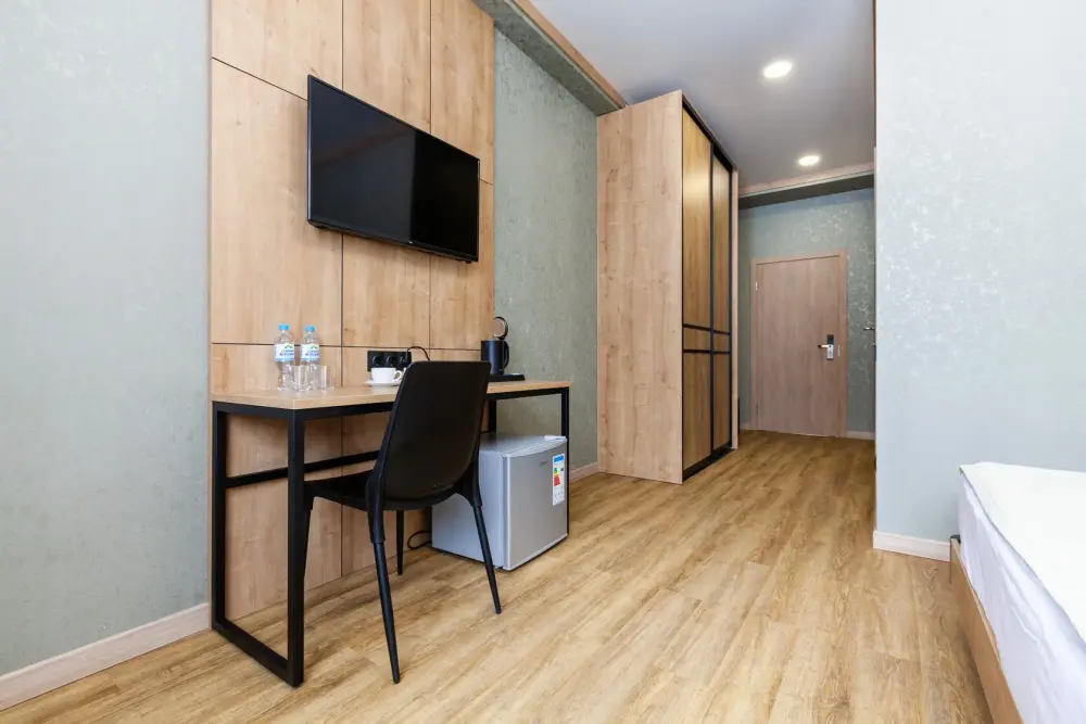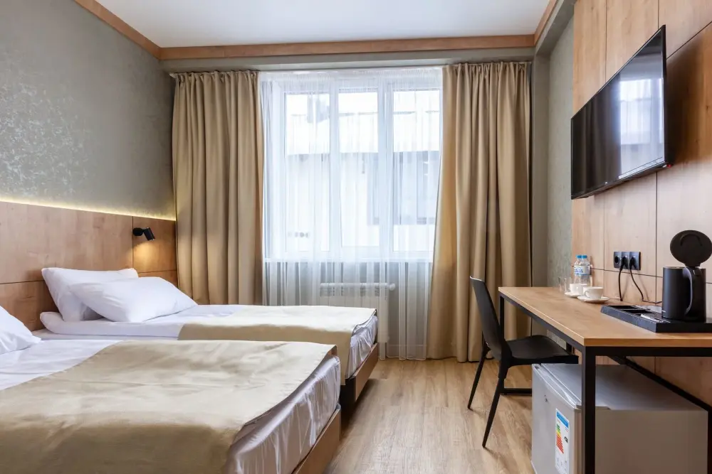 Номер предполагает 1 спальное место - 2-местная кровать. В наличии раскладной комфортный диван + возможность установки раскладной кровати (1 доп. место). Бутылка воды в качестве комплимента.