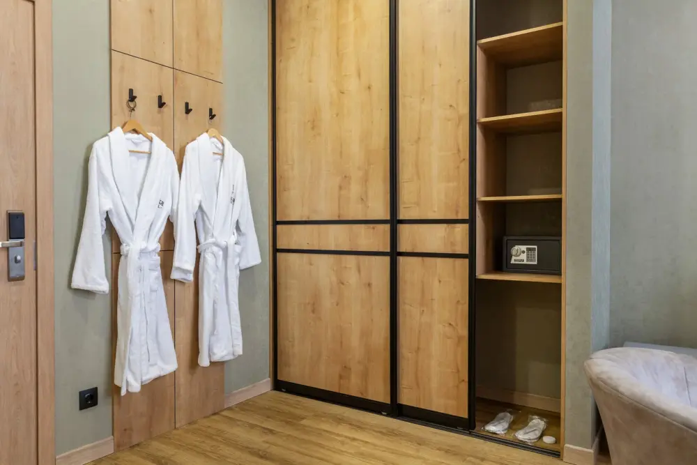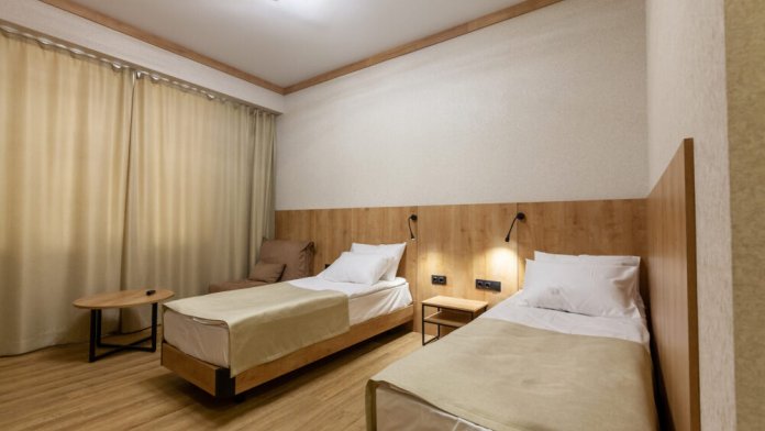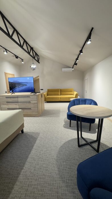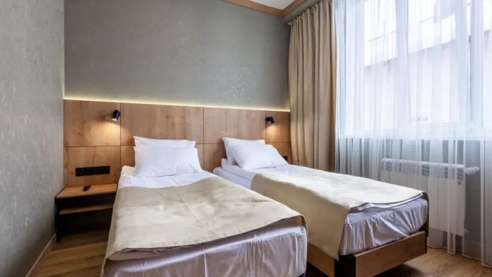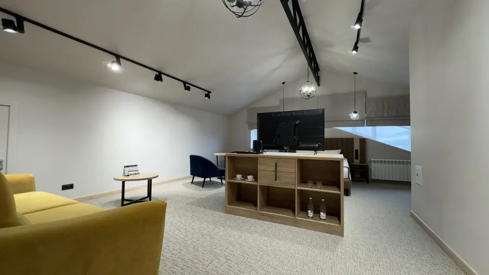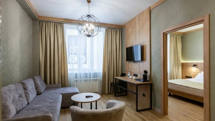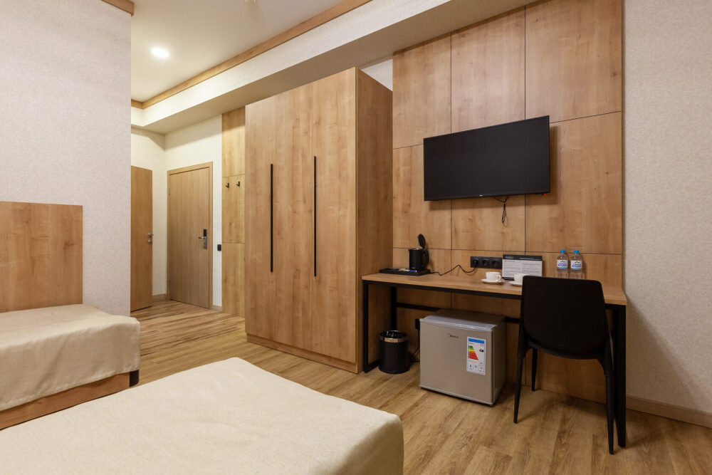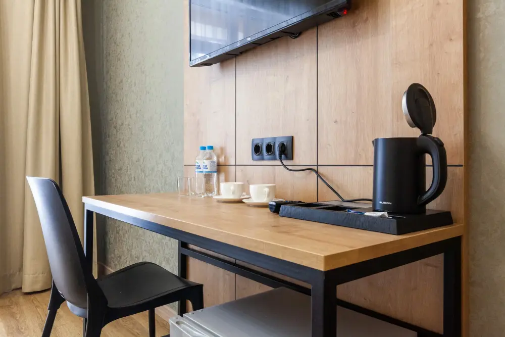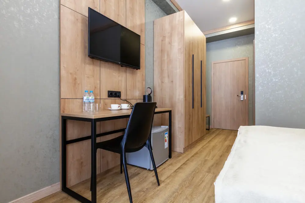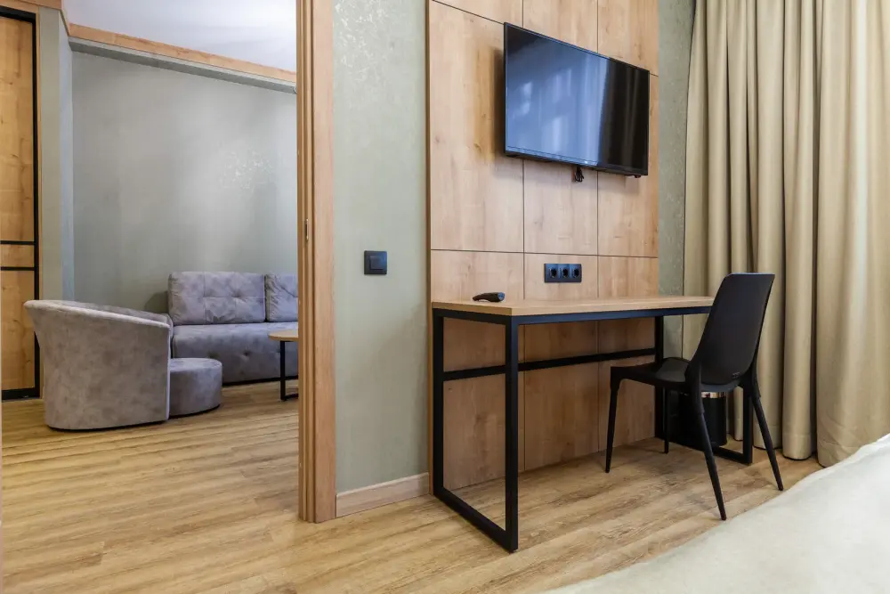 Номер предполагает 1 спальное место - 2-местная кровать. В наличии раскладной комфортный диван + возможность установки раскладной кровати (1 доп. место). Бутылка воды в качестве комплимента.