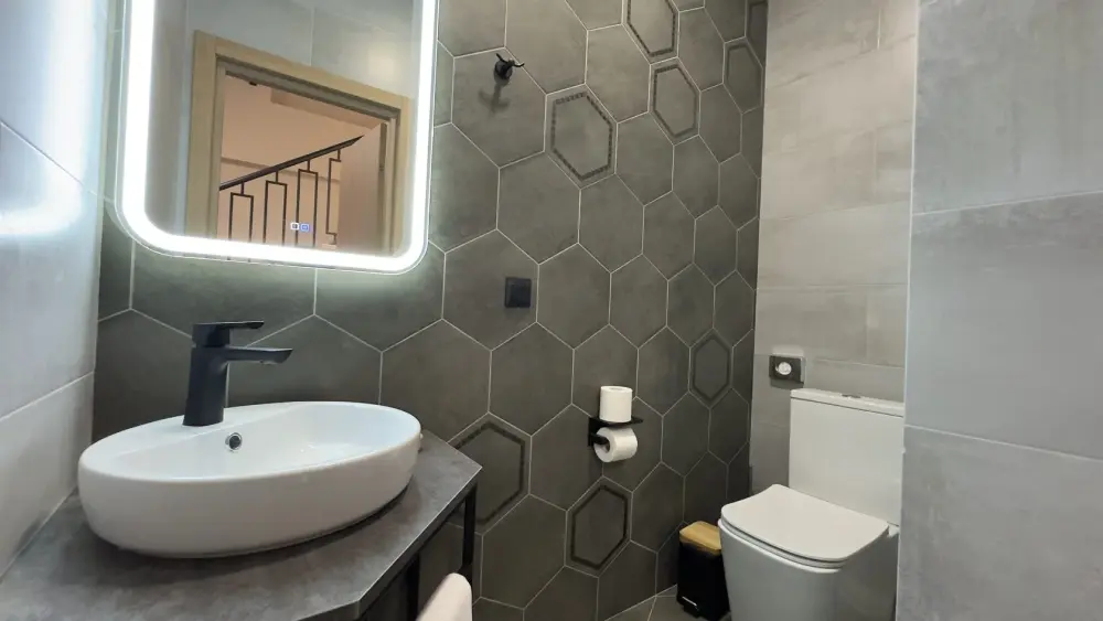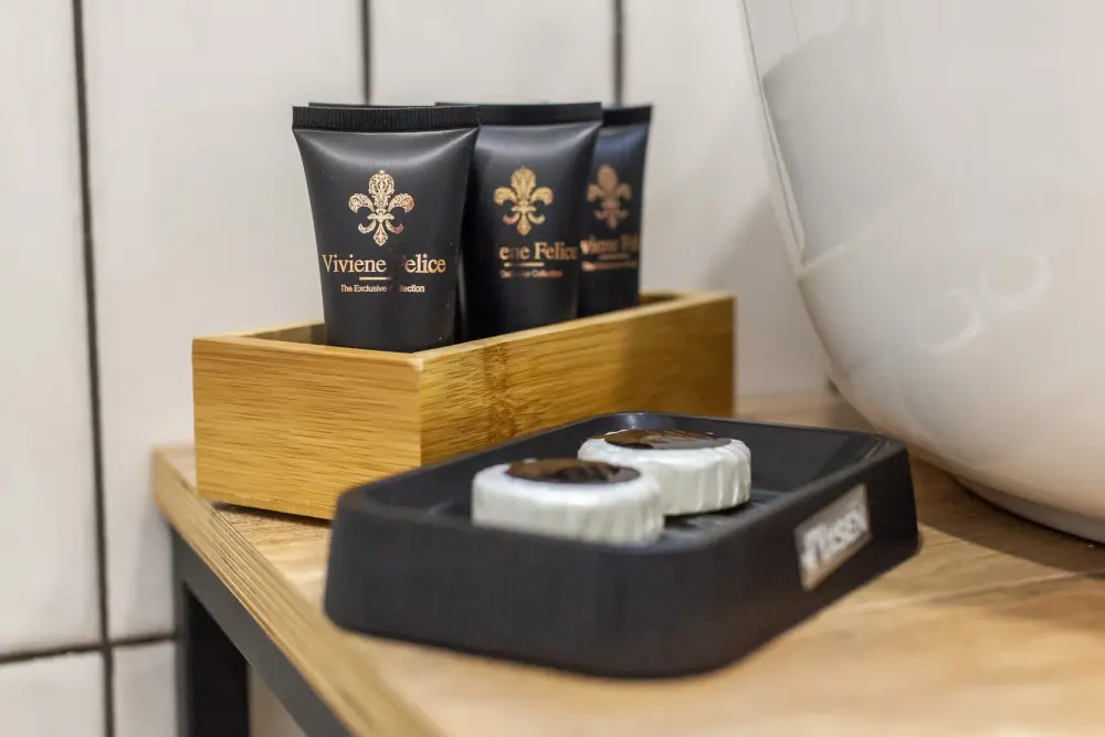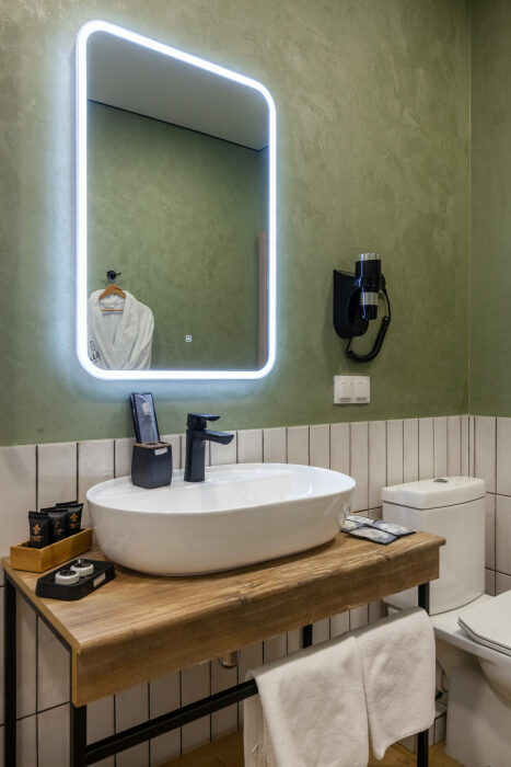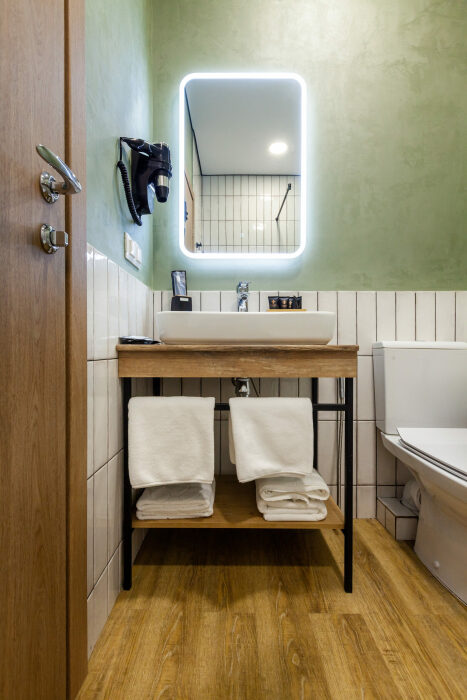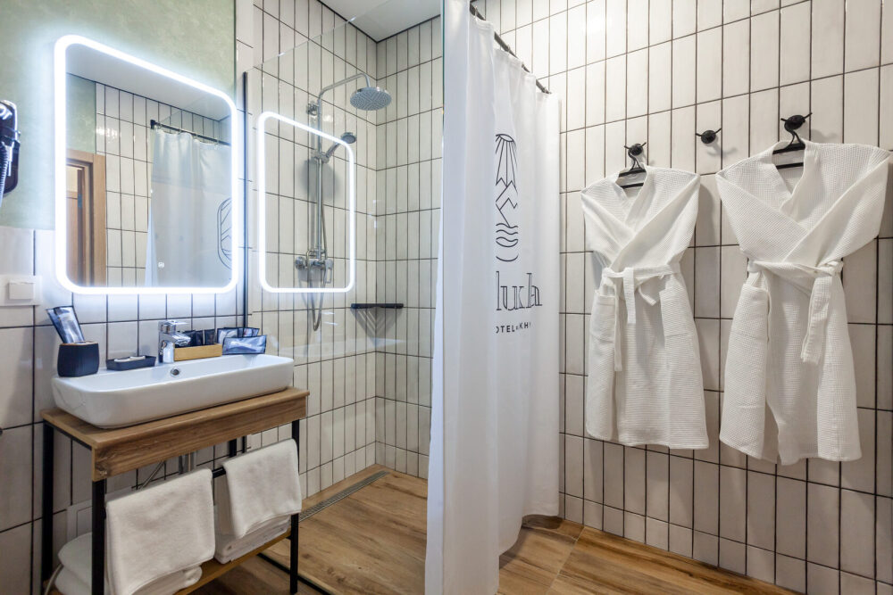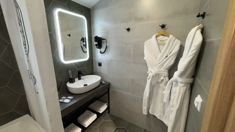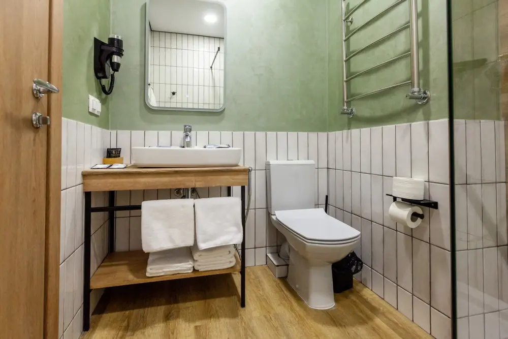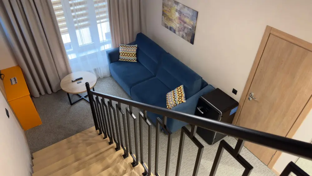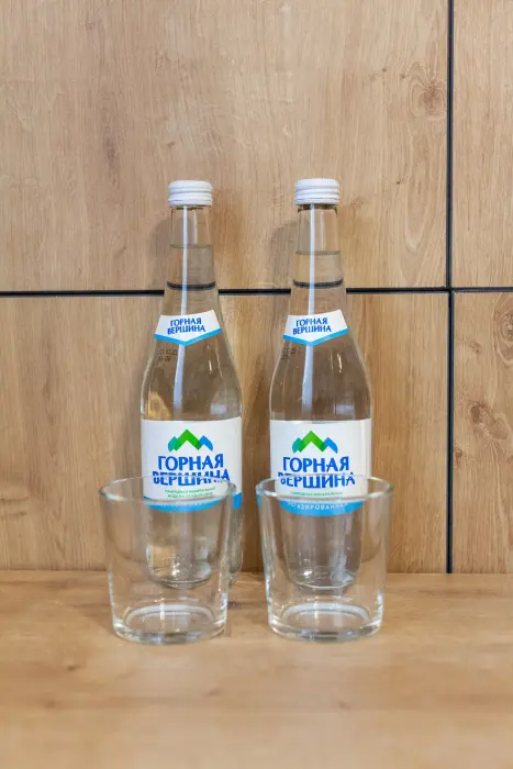 В номере 2 ванные комнаты - на нижнем уровне санузел, на верхнем уровне санузел + ванна. Бутылка воды в качестве комплимента.