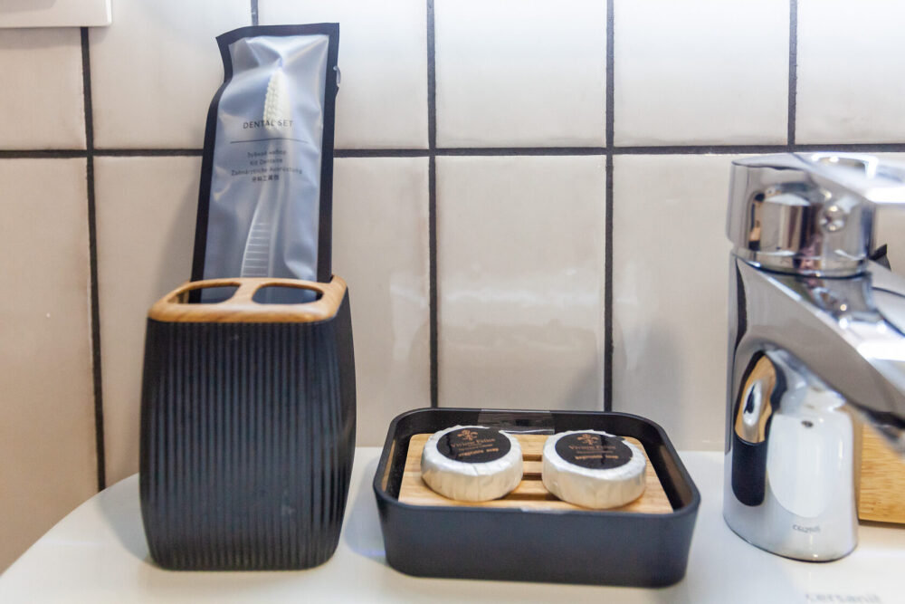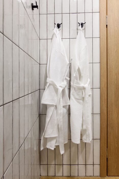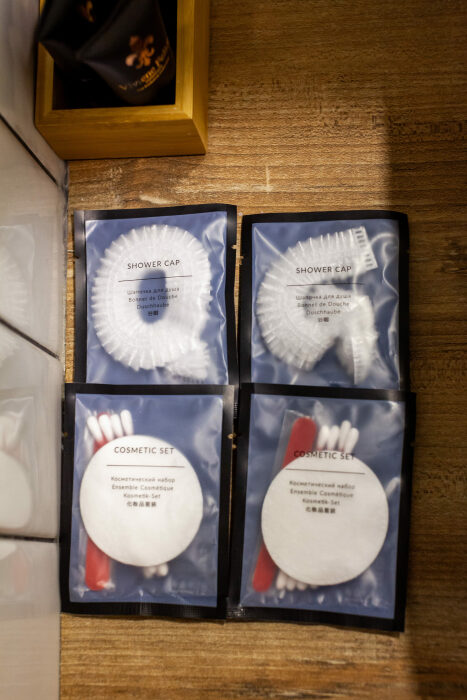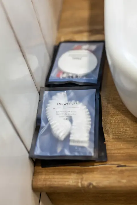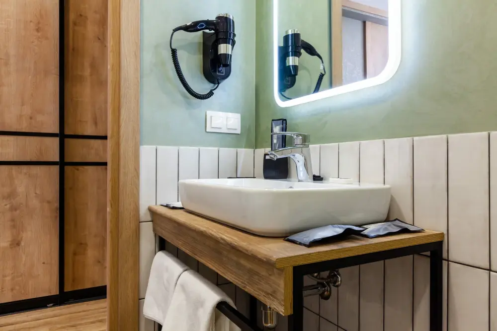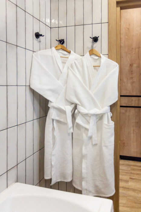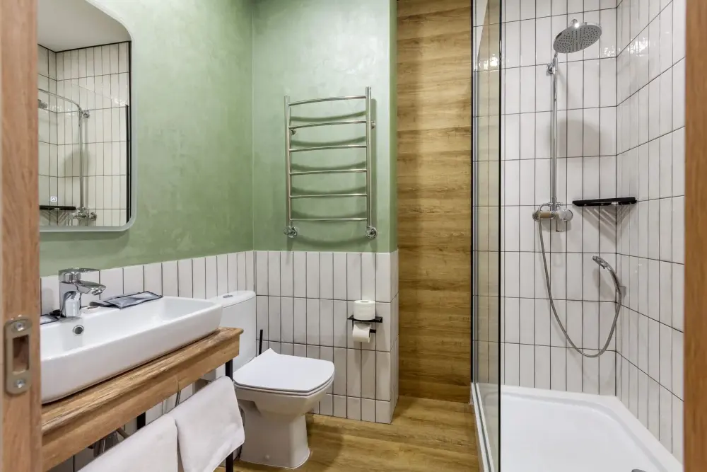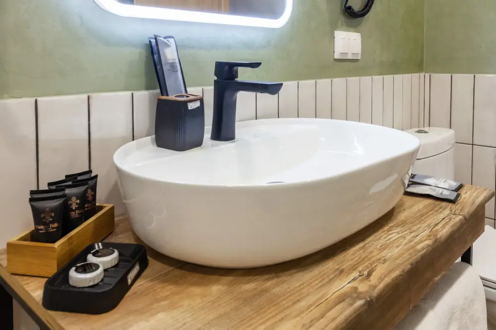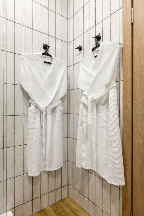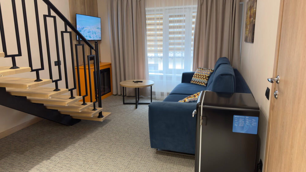 В номере 2 ванные комнаты - на нижнем уровне санузел, на верхнем уровне санузел + ванна. Бутылка воды в качестве комплимента.
