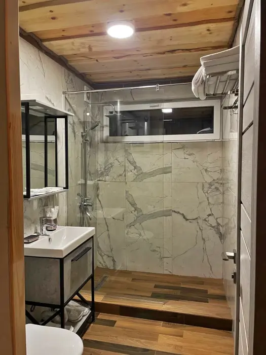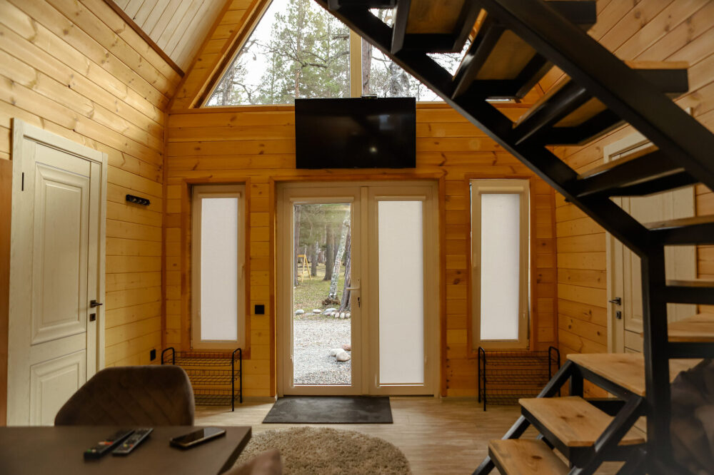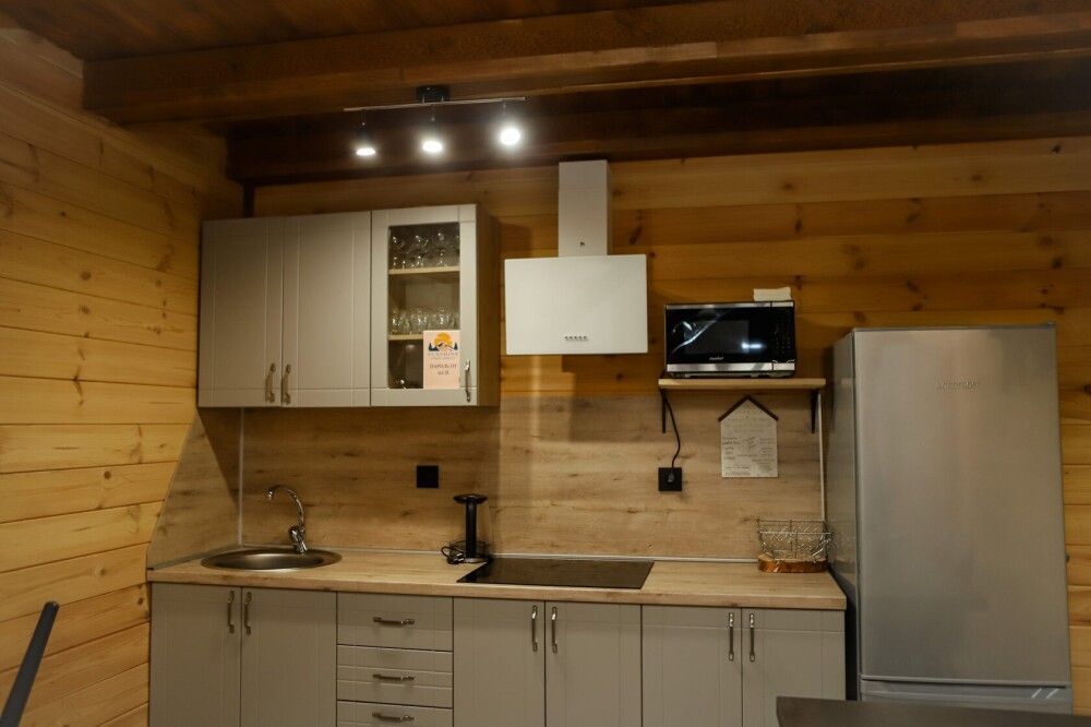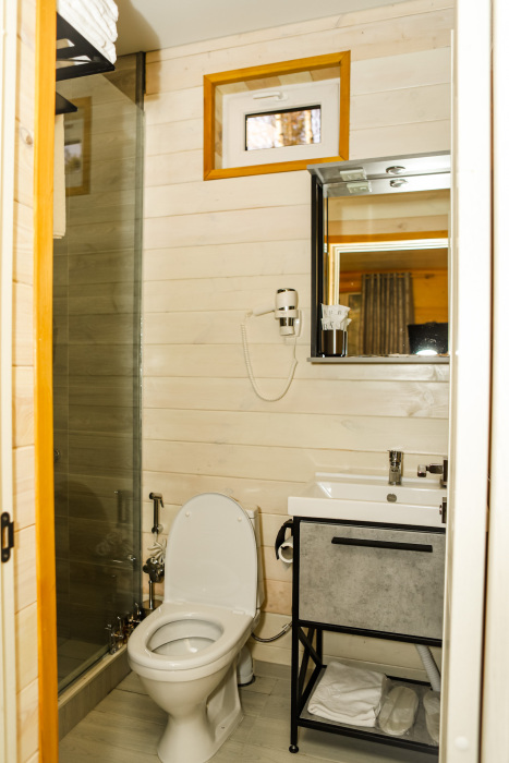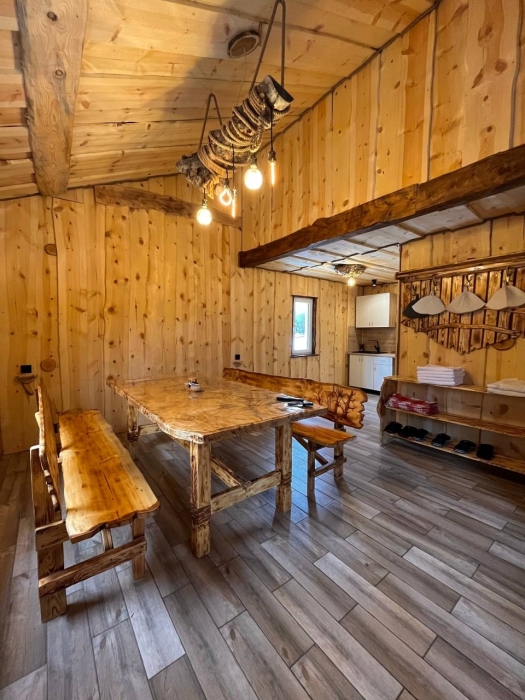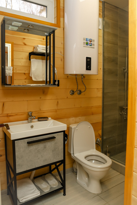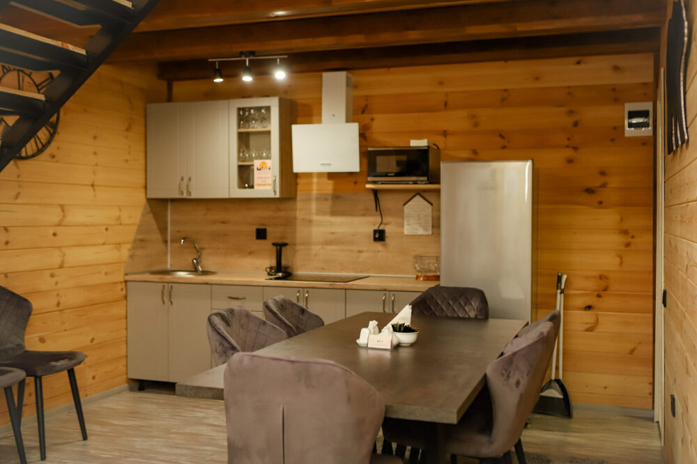 Внутри: Стандартная кровать с ортопедическим матрасом; Вся необходимая посуда, горный чай, конфеты; 50-дюймовые телевизоры со Smart-TV; Ванная косметика premium-сегмента Grass; Теплый пол с возможностью регуляции в каждой комнате. Утюг, сушилка (по запросу).