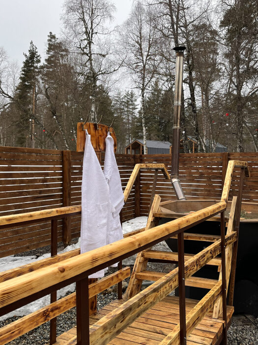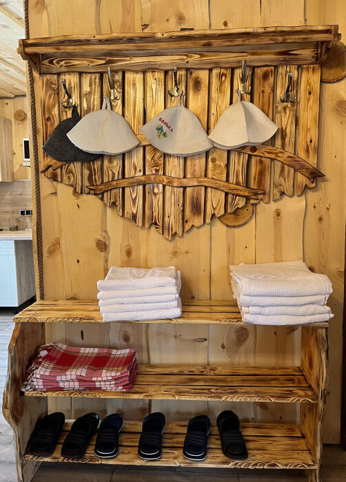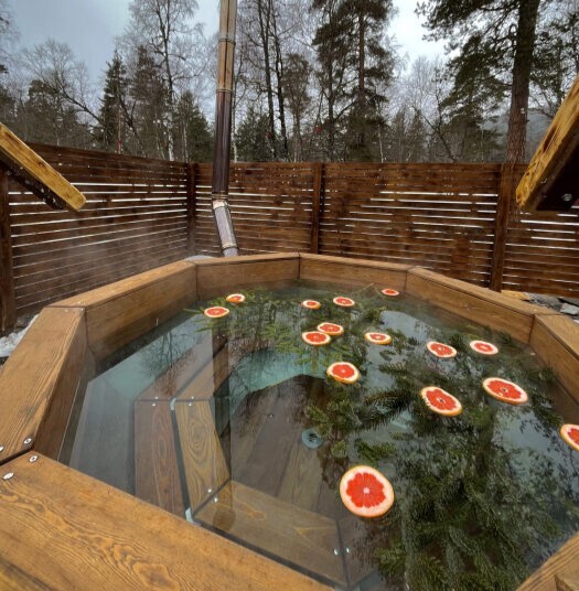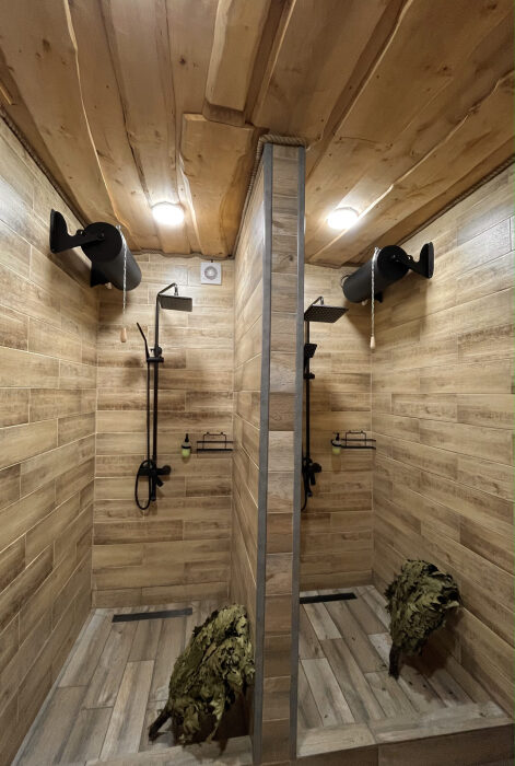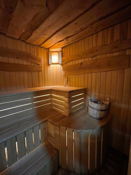 - Баня с холодной купелью и горячим чаном: мягкие халаты, набор банных полотенец, удобные тапочки, чистые простынки для парной и отдыха., банная косметика, фен, тропический душ.