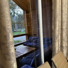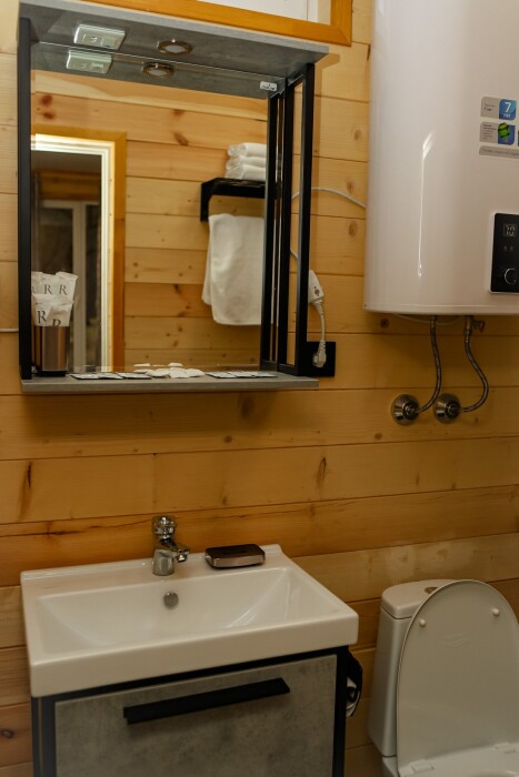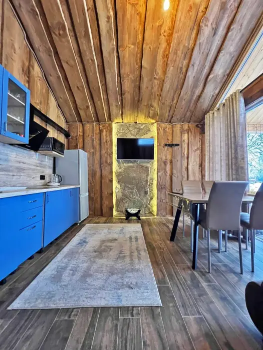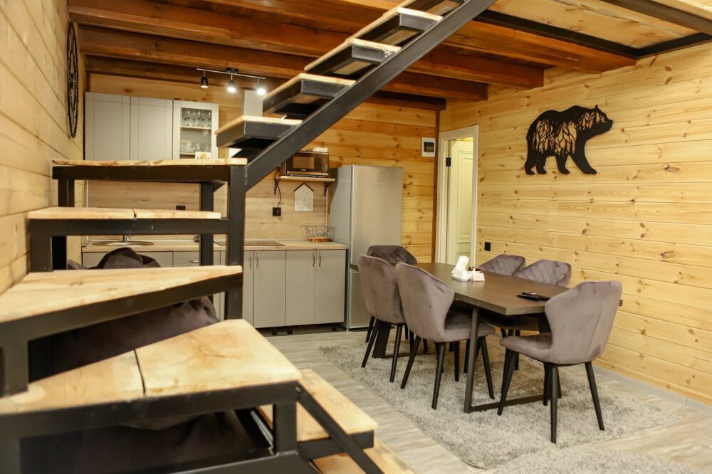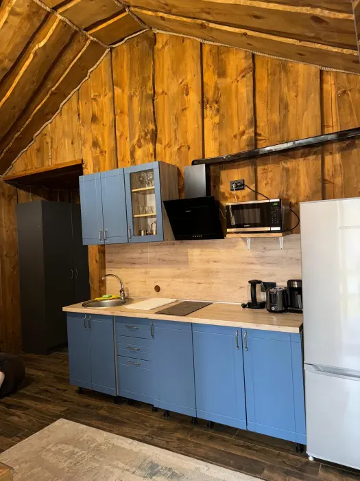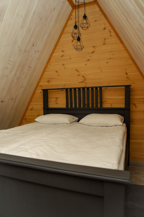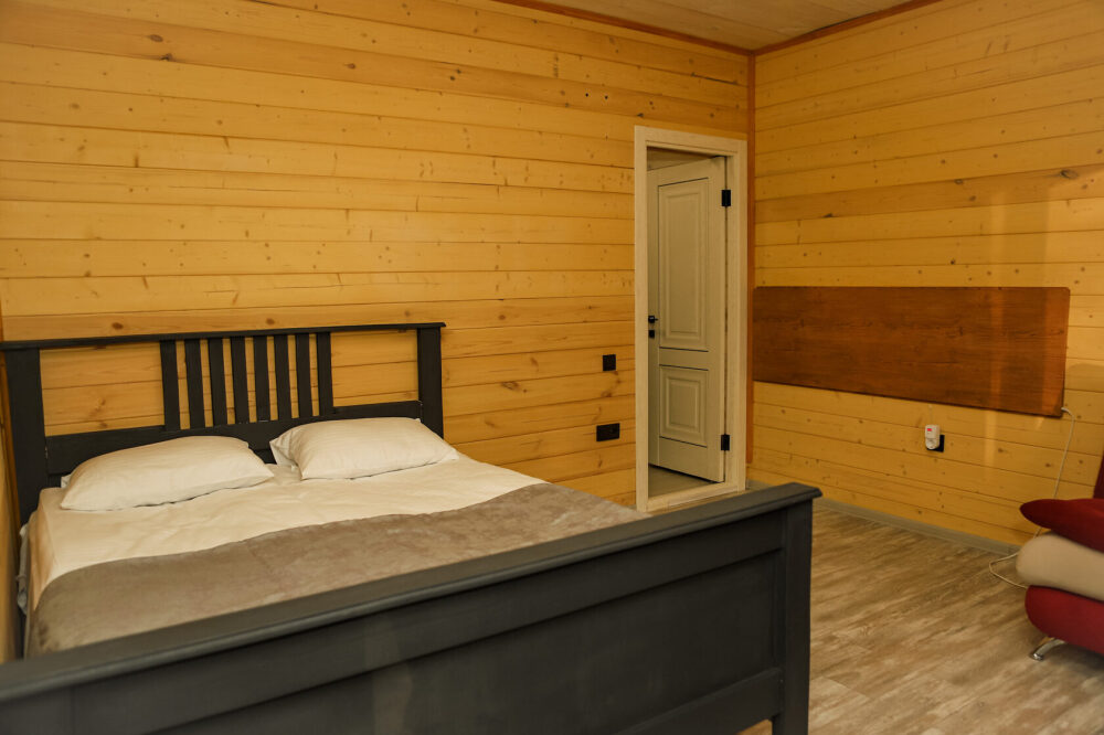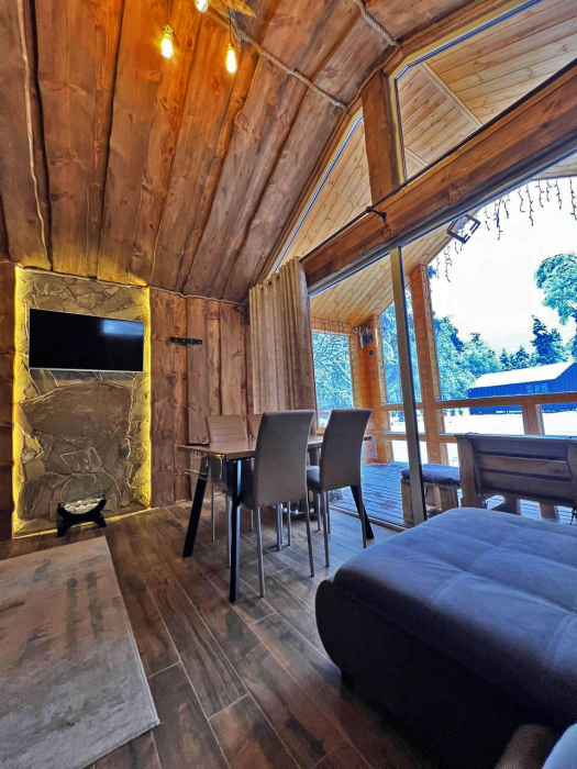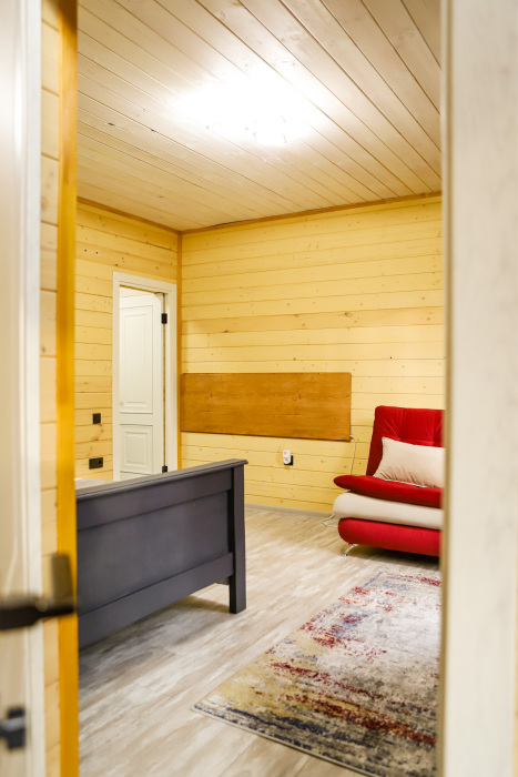В доме: две просторные спальные комнаты, в каждой комнате имеется по одной двуспальной кровати и раскладному дивану на двоих и телевизоры SMART TV. Большая просторная кухня со всей необходимой техникой и кухонной инвентарь, большой стол на 10 человек и выход в отдельный санузел с кухни. И антресольный этаж -являющийся изюминкой нашего дома с нереальным видом, в котором расположена двуспальная кровать.»