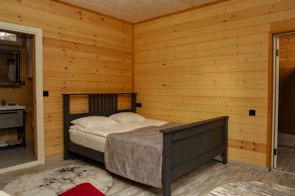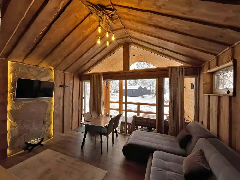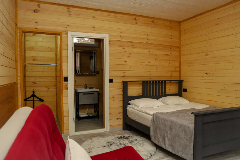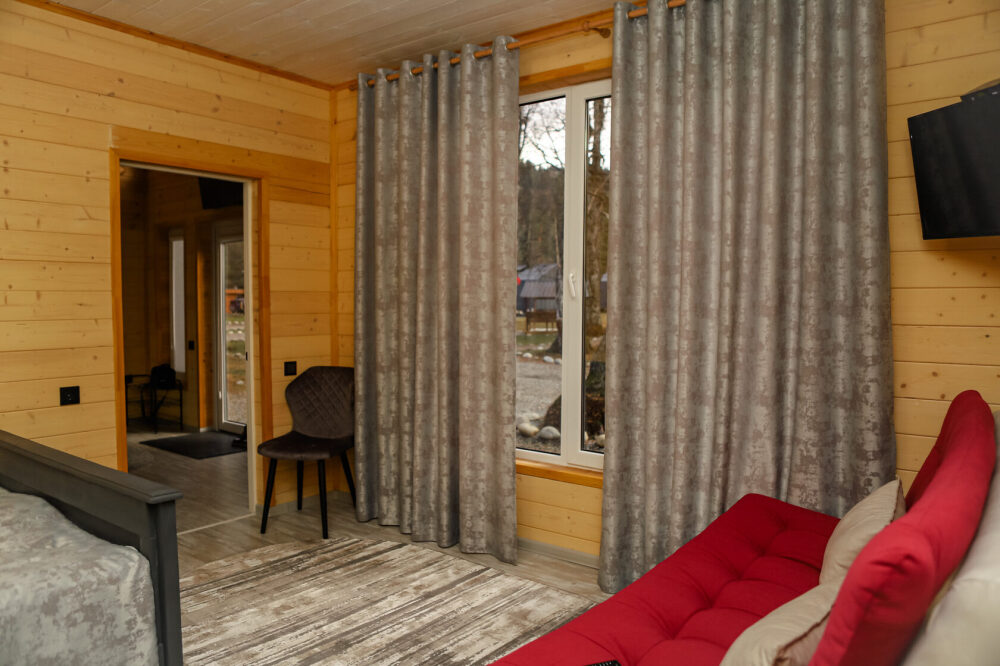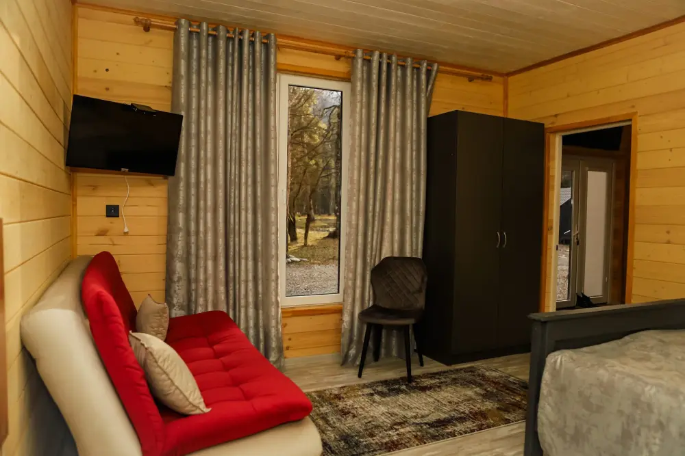 Расположиться предлагается в шале, оснащенном двуспальной кроватью, вместительным шкафом для одежды. Санузел снабжен душевой, раковиной, набором мягких полотенец, гигиеническими и косметическими средствами. Общая лаундж зона обустроена удобным диваном и телевизором. Из окон открывается вид на горные вершины.