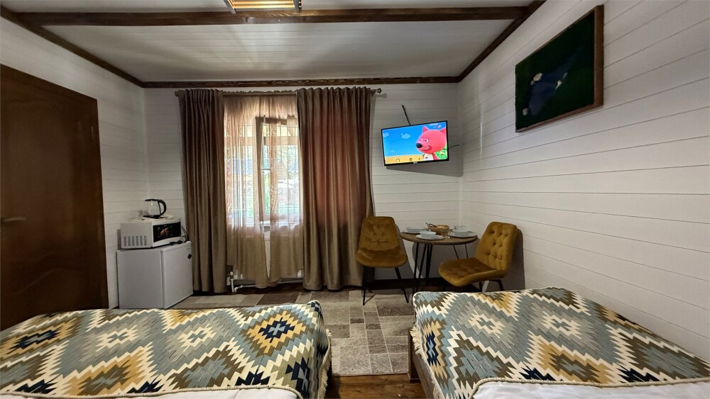 Имеется телевизор, шкаф, вешалка, анти-москитная сетка, плотные шторы, отопление, журнальный столик, чайник, холодильник, свч-печь, стол обеденный, стулья, мини-кухня, посуда, корзина для мусора.