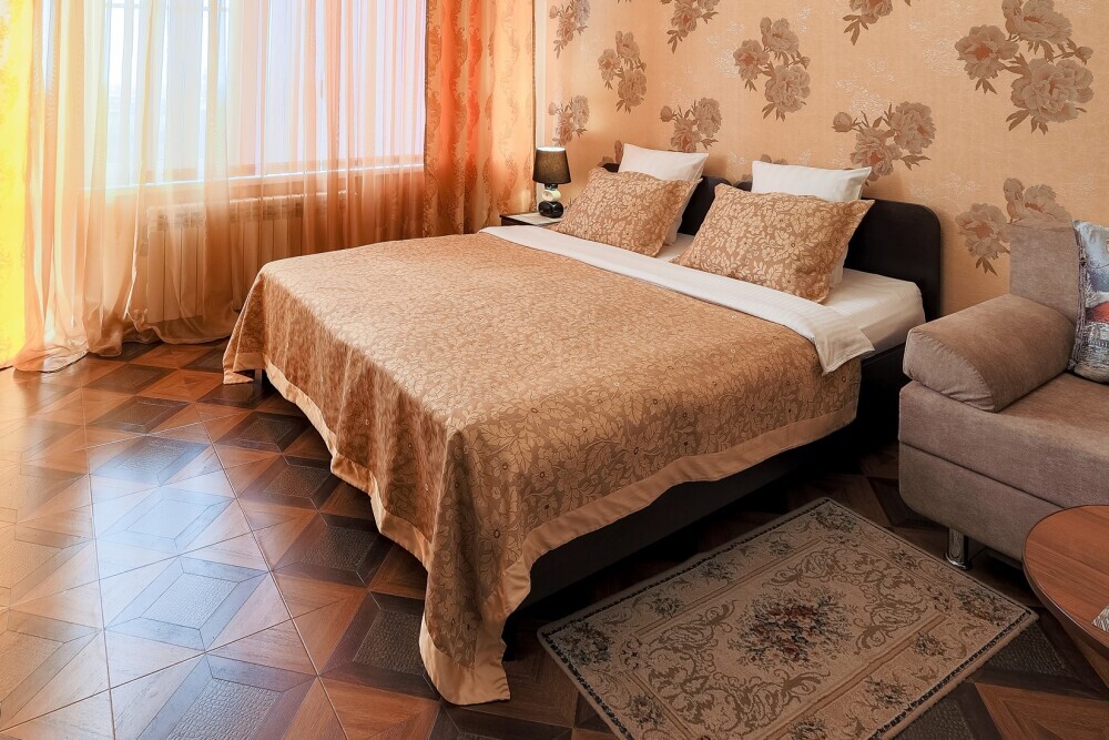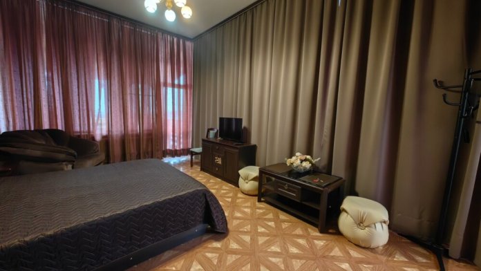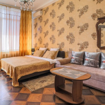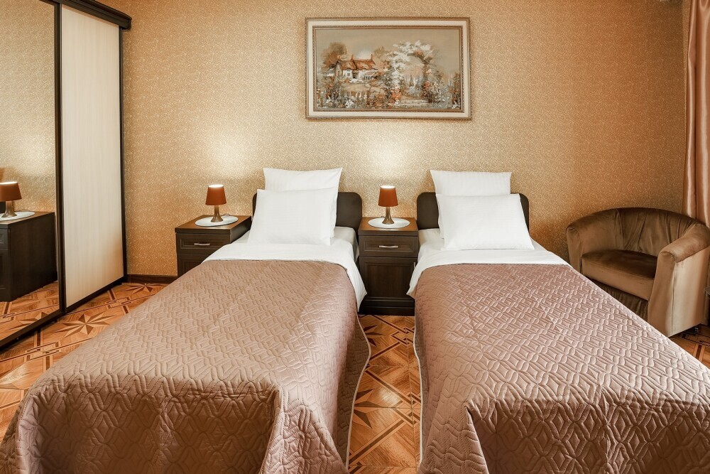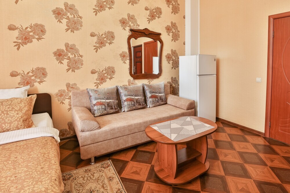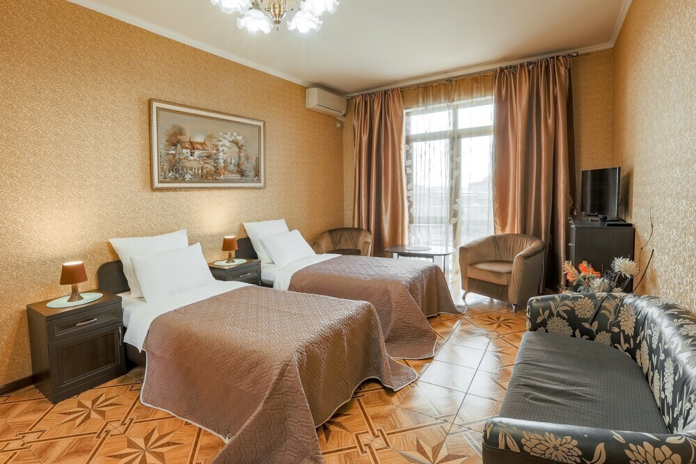 В номере: 2 односпальные кровати или 1 двуспальная кровать, 1 двуспальный диван.