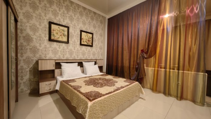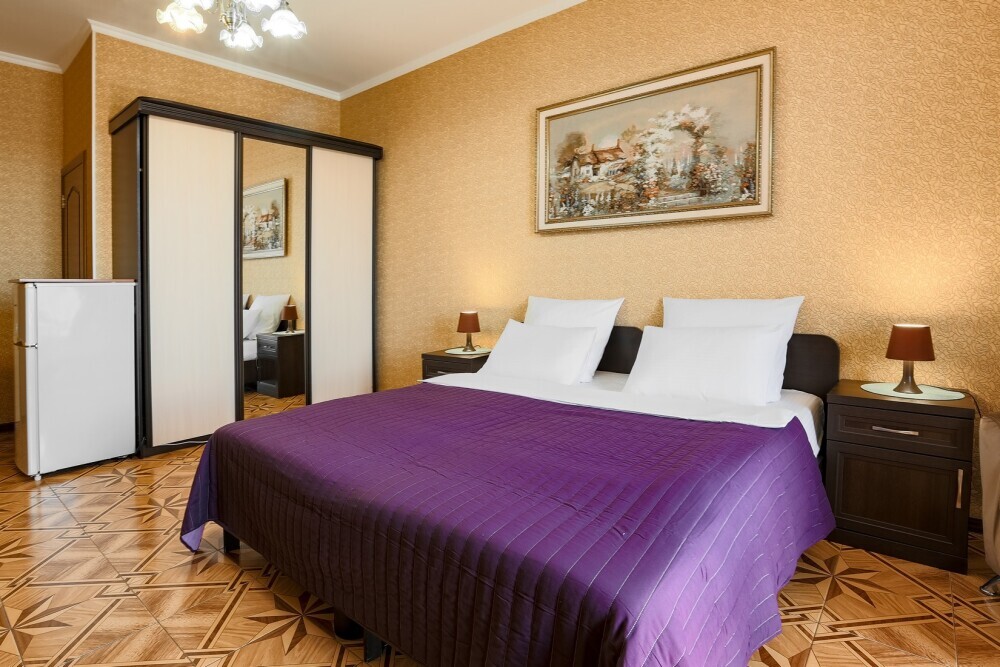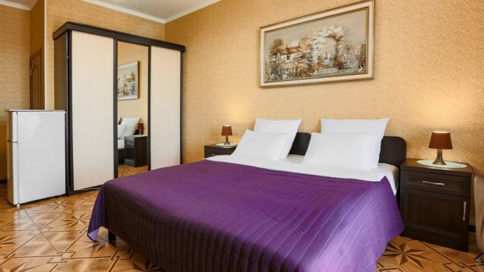 В номере: 1 двуспальная кровать или 2 односпальные кровати, 1 еврораскладушка.