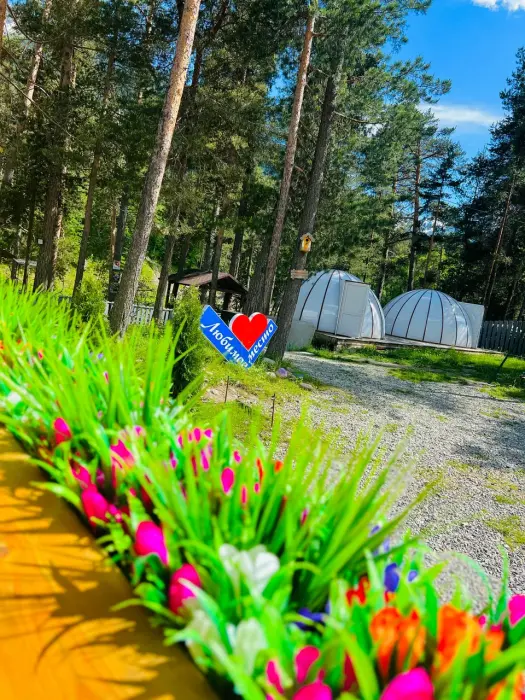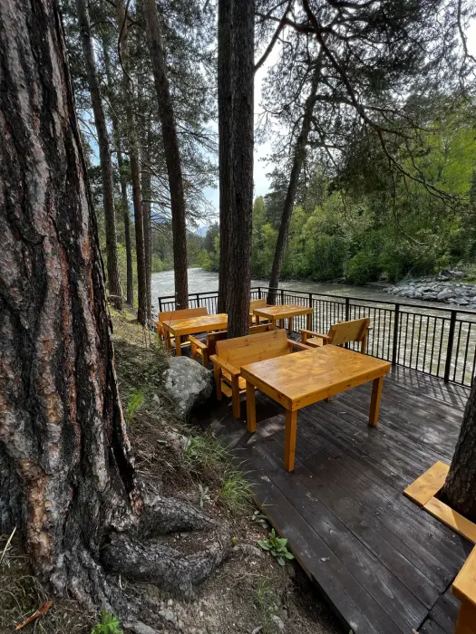 На территории есть парковка, бесплатный Wi-Fi, барбекю-зона с мангалом, баня, чан, детская и смотровая площадки. Можно посетить кафе и насладиться лёгкими закусками. Доступен прокат снаряжения для зимних видов спорта. А также специальная комната для сушки и хранения. К территории примыкает отличная прогулочная зона по набережной реки.