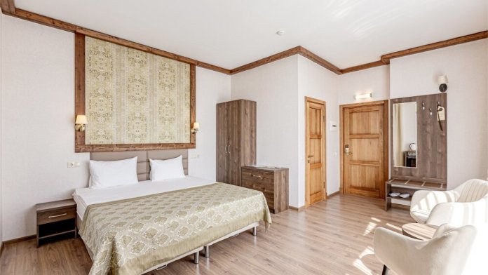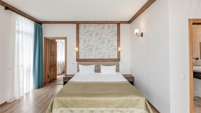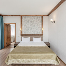 Номер отличается элегантным стилем. Небольшая гостиная соседствует со светлой спальней, что представляет собой идеальное решение для долговременного проживания. А возможность размещения дополнительной детской кроватки делает номер замечательным местом для семейного отдыха. Просторный двухкомнатный номер с двуспальной кроватью, ванной комнатой и прихожей.