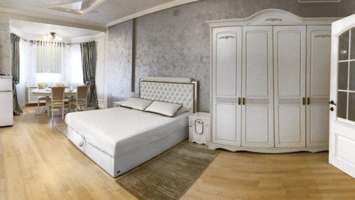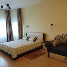 Номер категории Студия оснащен двуспальной кроватью, шкафом, кухней с варочной поверхностью, микроволновой печью, электрическим чайником, холодильником, телевизором, обеденным столом на две персоны, посудой на две персоны. Санузел совмещенный.