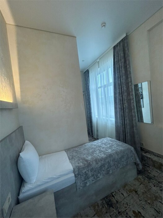 Номер оснащен: двуспальная кровать, телевизор, кондиционер, шкаф, посуда, чайный набор, журнальный столик, раскладной диван, два стула, бра, халаты средства гигиены, комплект полотенец 3-х видов, душевая, санузел, фен, зеркало.