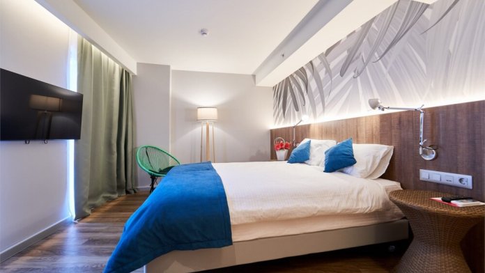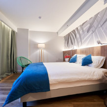 Сами апартаменты представляют собой помещение из двух отдельных комнат: спальни и гостиной совмещенной с кухней. Кухня оборудована электрической плитой посудомоечной машиной, микроволновой печкой, холодильником. Есть фен, комплект полотенец для каждого гостя. Есть шампунь, гель для тела и жидкое мыло. В целях безопасности вход в апартаменты находится под постоянным видеонаблюдением.