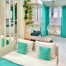 - из техники: большой ТВ с 130 кабельными каналами, холодильник, микроволновая печь, тостер, яйцеварка, вытяжка с подсветкой, индукционная плита и посуда к ней, стиральная машина, сплит-система, бойлер для бесперебойной подачи горячей воды, чайник, фен, подсветка спальной зоны на пульте управления;