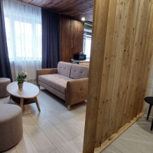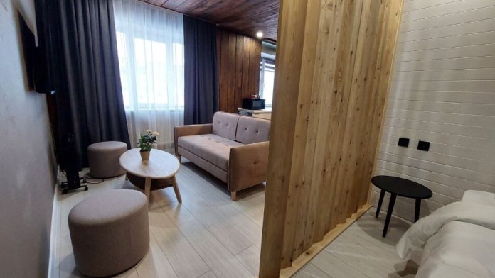Круглосуточное бесконтактное заселение. Для Вашего комфорта большая двуспальная кровать и раскладной диван в гостиной: