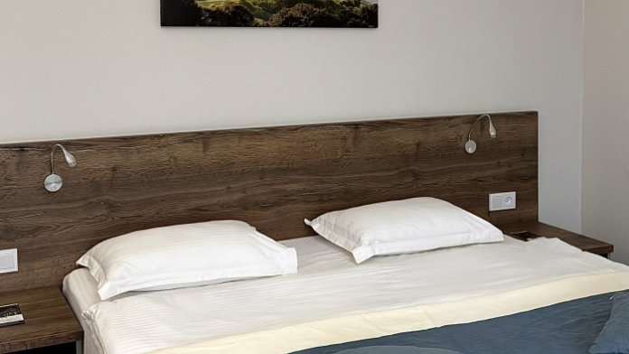 Просторный номер с двуспальной кроватью и возможностью организовать дополнительное место (кровать-раскладушку). Номер со всей необходимой мебелью и средствами для комфортного проживания.