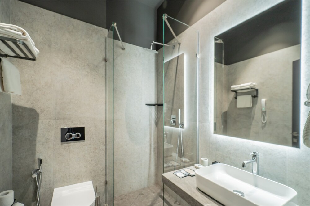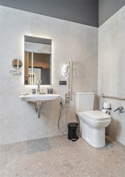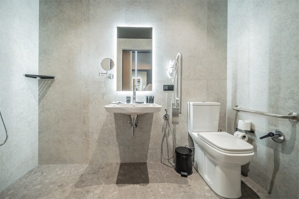 • Специально оборудованная ванная комната с душевой кабиной и санузлом, адаптированными для маломобильных гостей.