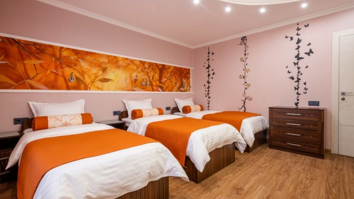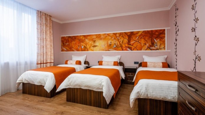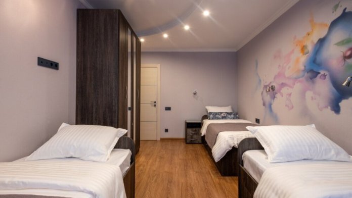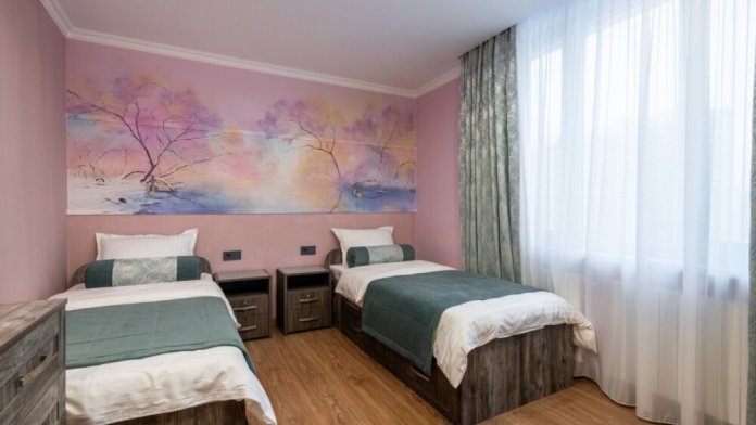 Дизайн интерьера комнат выполнен в спокойных пастельных тонах, большие окна оснащены шторами блэкаут, у каждой кровати имеется розетка и индивидуальное освещение.