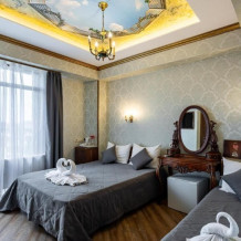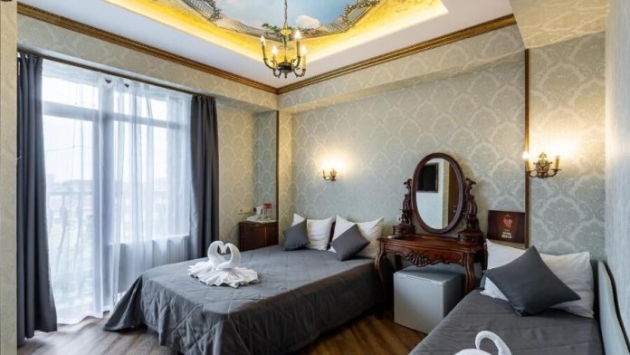 Корпус «Наташа Ростова» пгт. Сириус, ул. Казачья, 16. Двухместный номер с двумя раздельными кроватями, оборудованный холодильником, чайником, посудой для чая. Теплый бассейн находится на территории корпуса Поручик Ржевский. При заселении в отель за номер вносится возвратный страховой депозит в размере 2000 рублей и берется курортный сбор -50 рублей с взрослого человека.