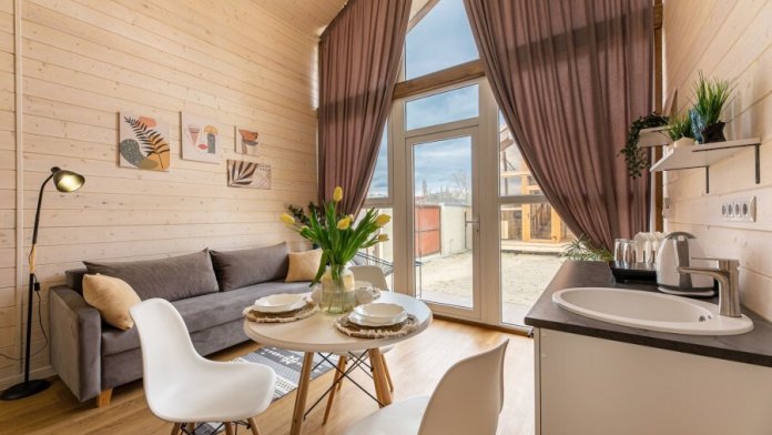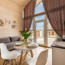 Для проживания гостей предусмотрены небольшие уютные домики в стиле Barnhouse с панорамными окнами. В домах есть все необходимое для комфортного пребывания: теплые спальни на первом и втором этаже, душ и туалет с горячей водой, полностью оборудованная кухня и большой диван. В мансарде под крышей можно организовать романтический вечер или устроить пространство для детей. У каждого домика есть небольшая терраса, на которой можно расположиться вечером и поужинать на природе, любуясь бескрайним небом.