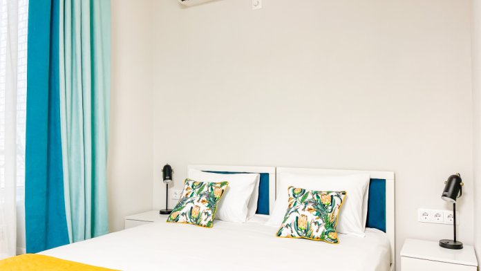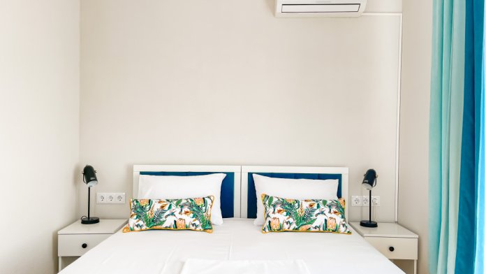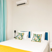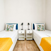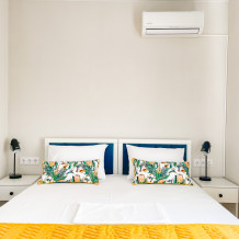 Две односпальные кровати или 1 кровать двухспальная (сприн-боксы с топером), 2 раскладных кресла, ТВ, холодильник, шкаф, столик, кондиционер, сан.узел с душем.
