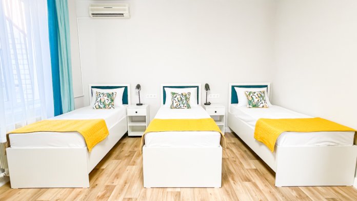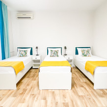 Три односпальные кровати или 1 кровать двухспальная (сприн-боксы с топером) и односпальная кровать, раскладное кресло, ТВ, холодильник, шкаф, столик, кондиционер, сан.узел с душем. Покрытие пола - линолеум.