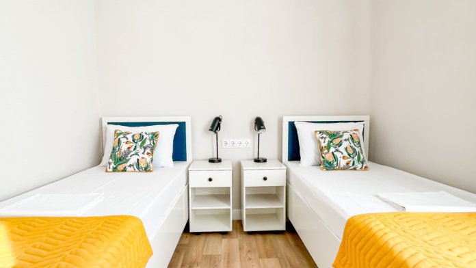 Четыре односпальные кровати или 1 кровать двухспальная (сприн-боксы с топером) и две односпальные кровати, доп. место: диван раскладной, ТВ, холодильник, шкаф, столик, кондиционер, сан.узел с душем в пол.