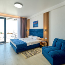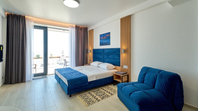 В апартаменте имеется спальная зона с удобной двуспальной кроватью или двумя односпальными кроватями, кухонной зоной с функциональным рабочим столом, тостером, микроволновой печью, столовой посудой. Бокалами, рюмками, стаканами, чашками, столовыми приборами, салатником, разделочной доской, ножами. Туалет с индивидуальными туалетными принадлежностями. В номере: столик с тремя стульями, настенное зеркало, шкаф, светильники, мини-холодильник, чайник, тостер, кондиционер. WI-FI, одноразовые тапочки.