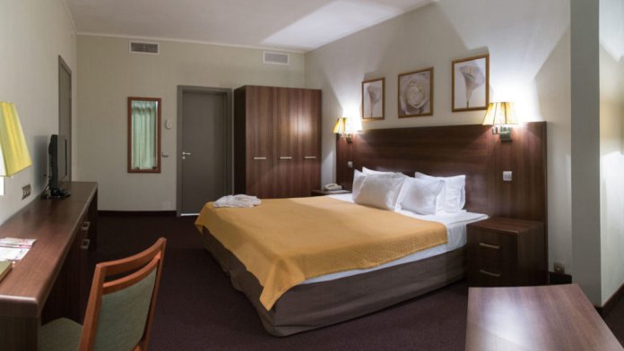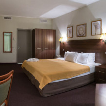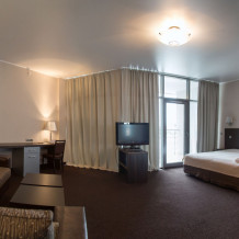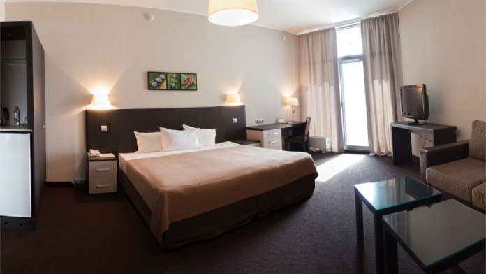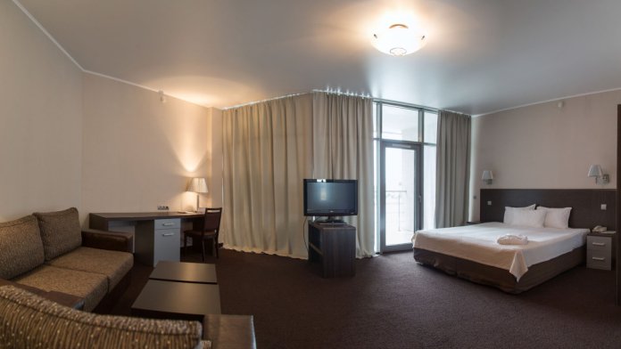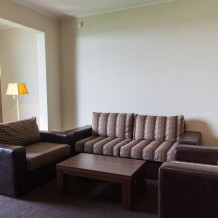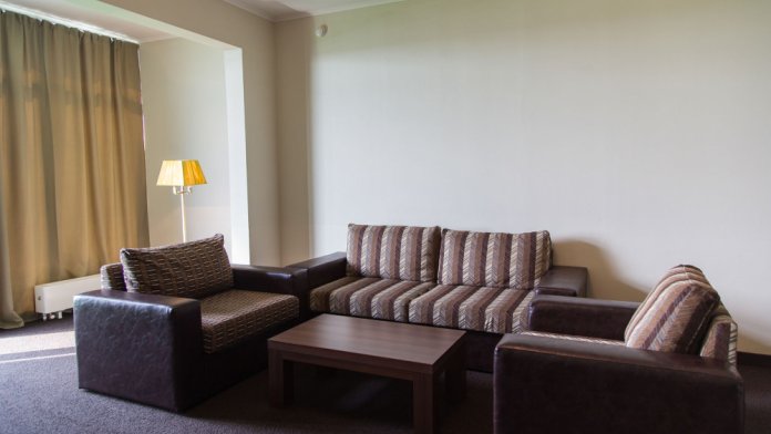 Однокомнатный номер улучшенной планировки площадью 35 м² оборудован дополнительным комплектом мягкой мебели.