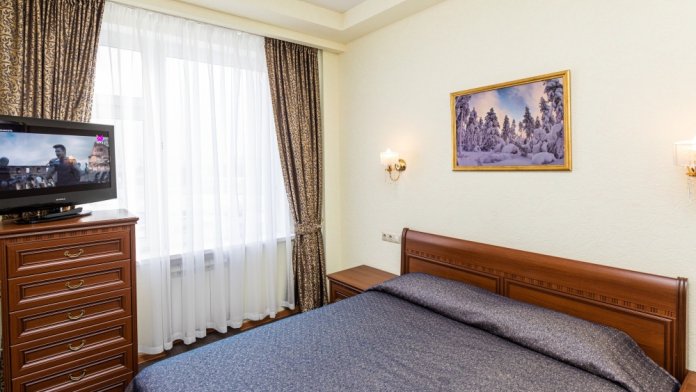 Просторный двухкомнатный номер площадью 35 кв.м., состоящий из спальни, гостиной и большой ванной комнаты с ванной. Гостиная делится на мягкую зону отдыха и рабочую зону. Оборудована мягкой мебелью с журнальным столиком, письменным столом с креслом и телевизором. Спальная комната оснащена двуспальной кроватью Queen Size (размер 160х200 см), туалетным столиком, комодом, шкафом и телевизором.