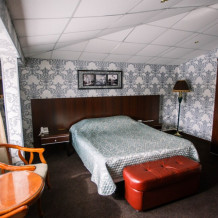 Двухкомнатный просторный и комфортабельный номер, площадью 38 кв. м с видом на город. Завтрак включён в стоимость проживания. В номере имеется: 1 двуспальная кровать, банкетка, 2 кож.кресла, 1 кож.диван, сейф, 2 торшера, мини бар ,чайник, гардероб, письменный стол, 2 тумбы, мини-прихожая, телевизор, 2 телефона, журнальный столик, ванная, камин, санузел, холодильник, халаты, фен, кондиционер, органайзер.